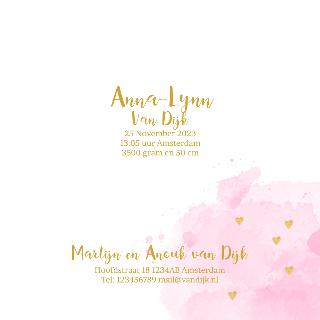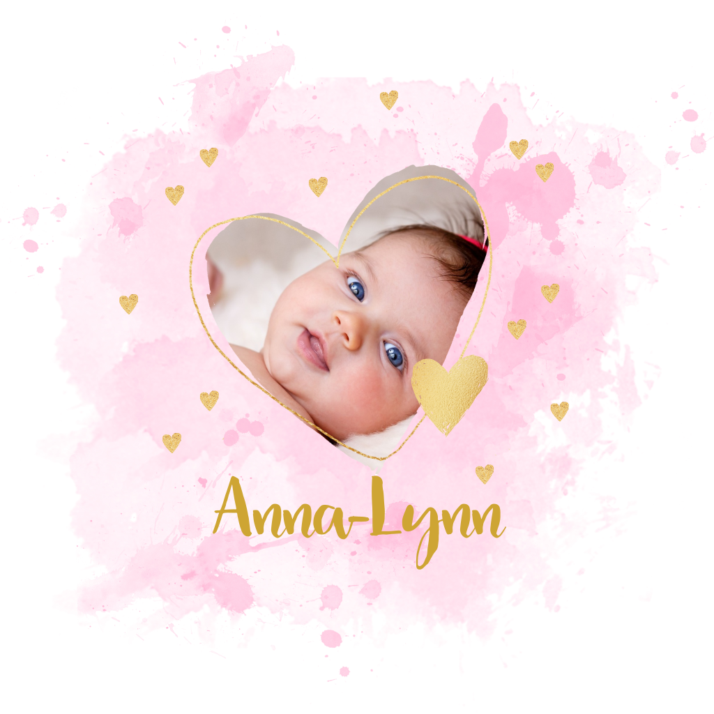 Heb jij een leuke foto van jouw kleine meid? Plaats hem op de voorkant van haar geboortekaartje in het hartjeskader. Om de foto heen is de kaart gepimpt met roze aquarel en goudkleurige hartjes.
