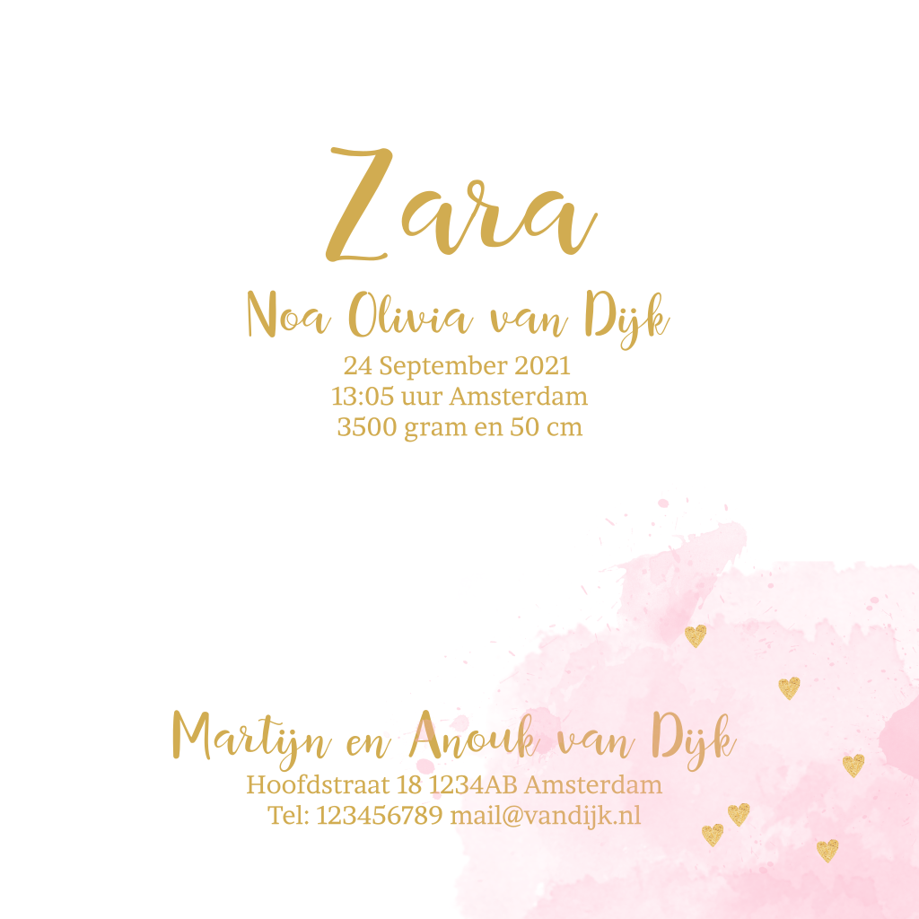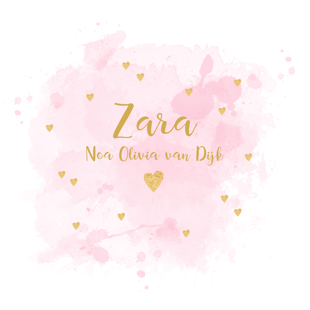 Een lief en hip geboortekaartje met aquarel en hartjes. Alle onderdelen kunnen worden verplaatst. Pas ook de teksten aan.