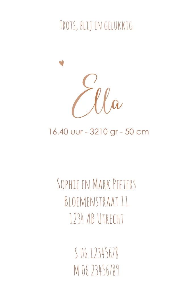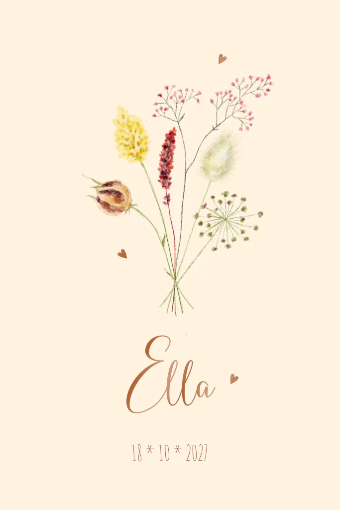 Een hip geboortekaartje voor een meisje met een boeketje veldbloemen met hartjes erboven op zachtgeel. Mooie letters in hoogglans maken het kaartje helemaal af.