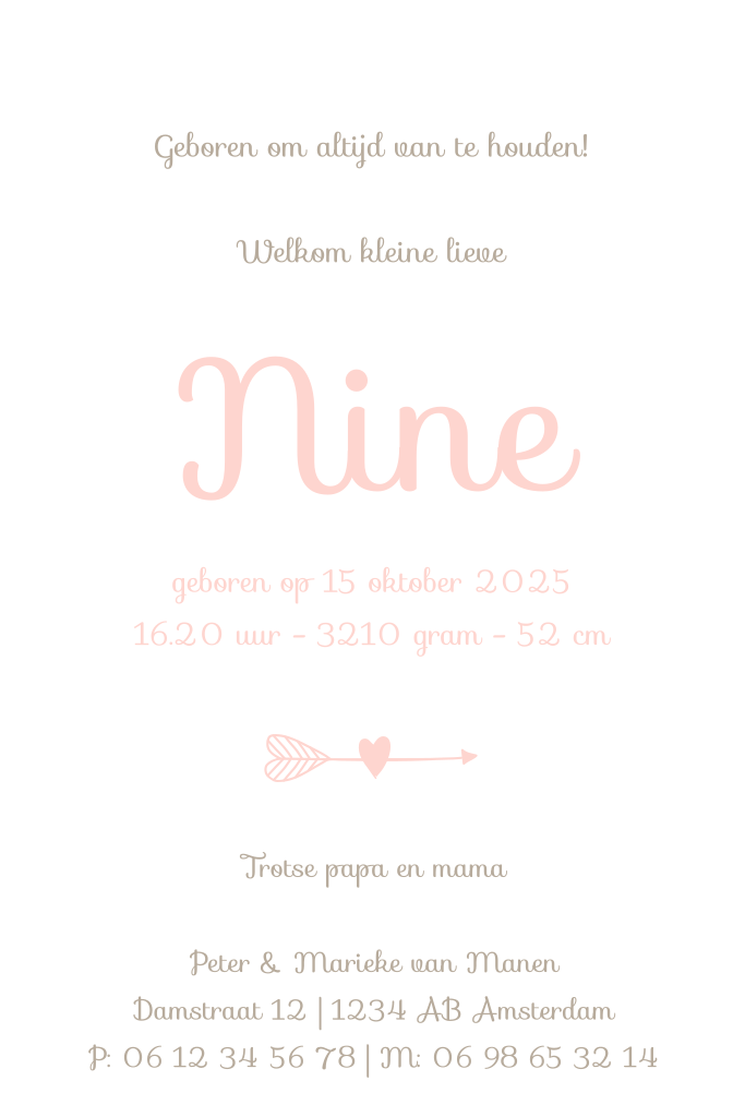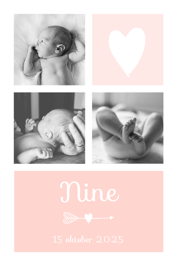 Een lief, staand fotokaartje voor de geboorte van een dochter. Gepimpt met een hartje, een pijl, zachtroze kleuren en 3 fotokaders. In de online editor kun je verschillende elementen aanpassen en eigen teksten schrijven. Wees creatief en maak hier hét babykaartje van jouw kleintje van!