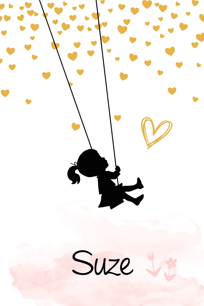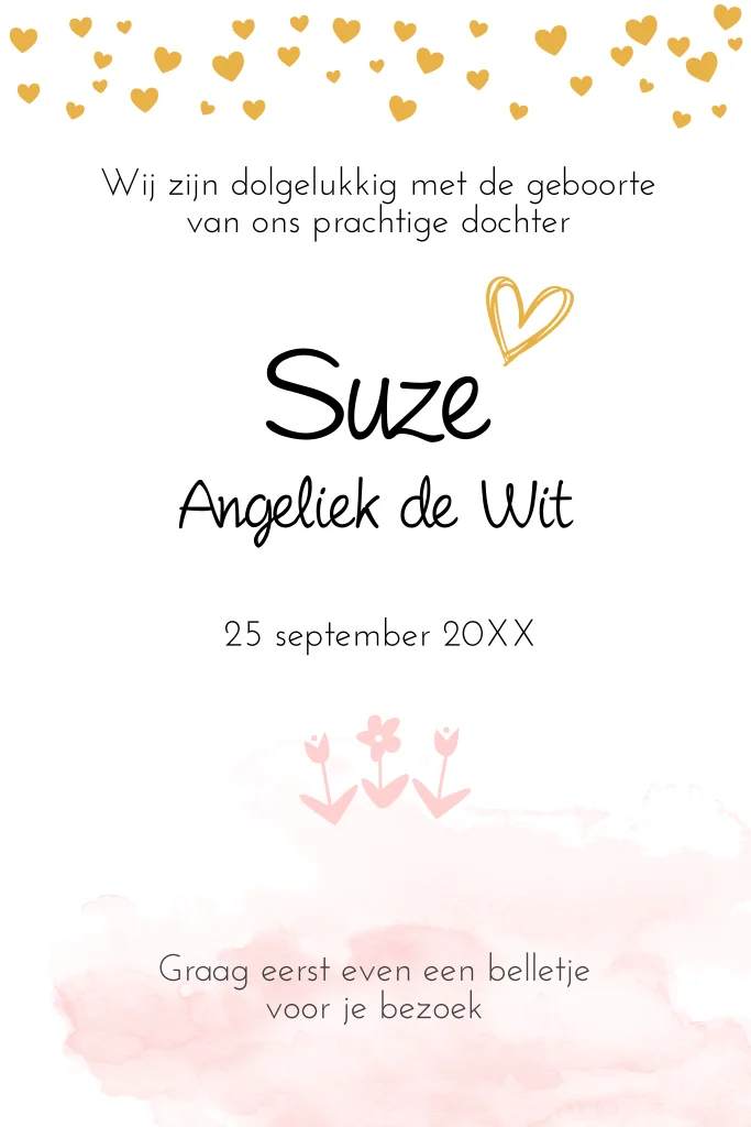 Lief geboortekaartje met watercolour en hartjesregen met daarop een meisje op een schommel in silhouet. Het silhouet geboortekaartje past goed bij een gouden envelop.