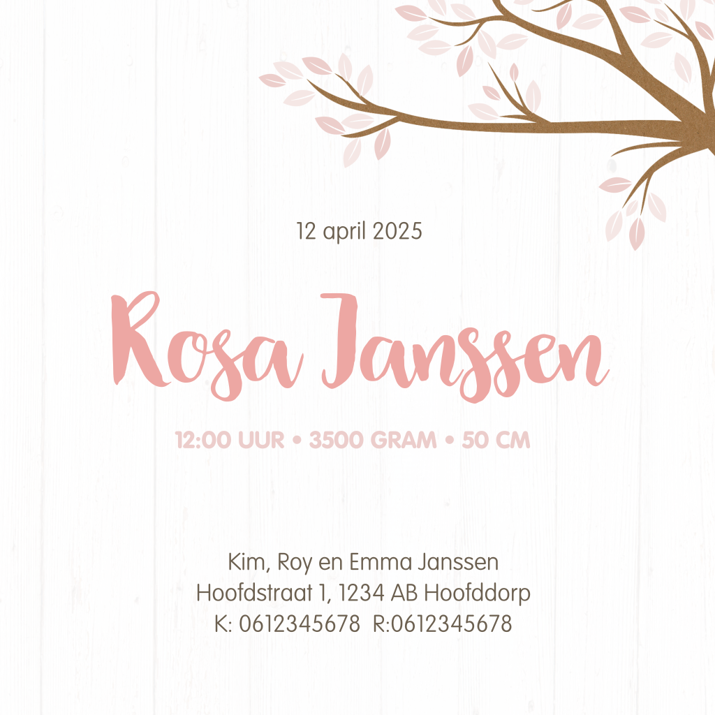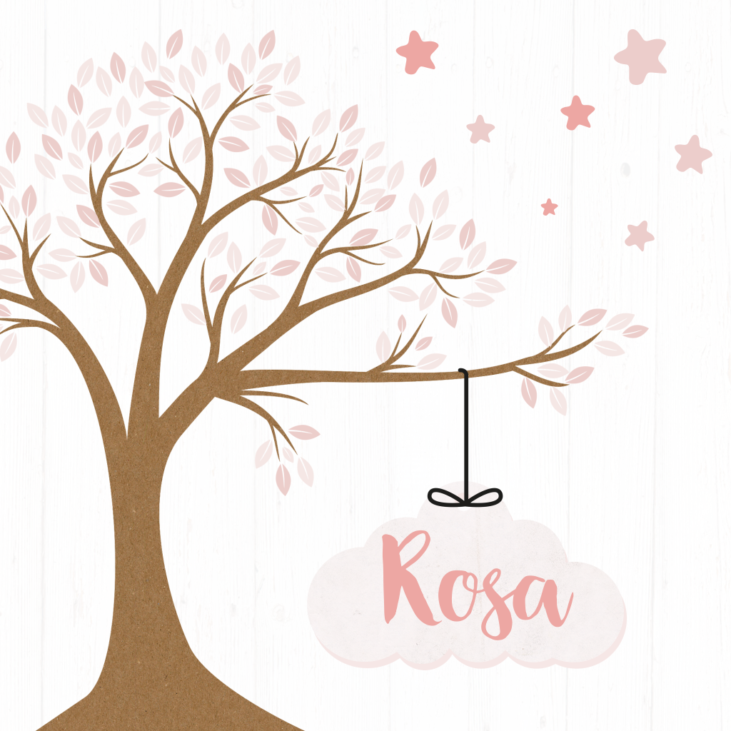 Dit hippe geboortekaartje heeft een boom op de voorkant, waarvan de blaadjes aan de binnenkant van de kaart weer terugkomen. Ook kun je een foto aan de binnenkant toevoegen. De combinatie van de witte achtergrond en de lichtroze kleuren, maken dit een lief kaartje. Met de sterren en wolkjes erbij is hij helemaal compleet!