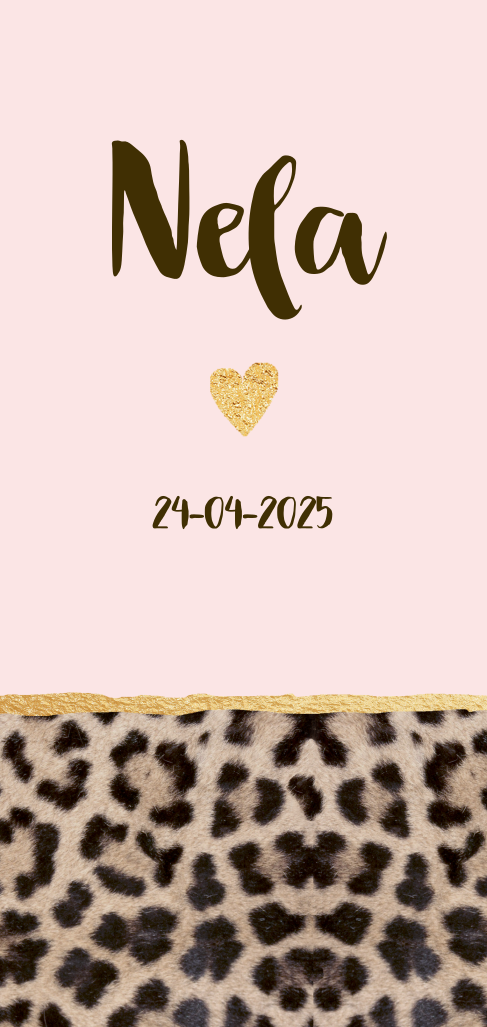 Een hip geboortekaartje voor een meisje met panterprint en hartje. Pas zelf de tekst aan in de editor. De roze achtergrondkleur is ook aanpasbaar.