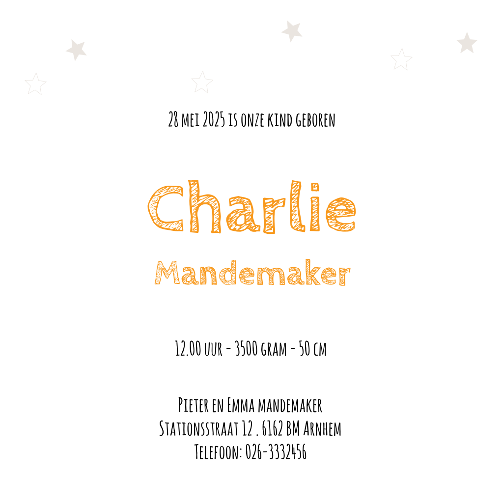 Een hip en stoer geboortekaartje met een boom en een vosje. Het vosje staat half achter de boom. Leuk is dat de oranje kleur van het vosje terug komt in de bloemen in de boom. Aan de binnenkant van de kaart staat de boom met een vogeltje die er uitvliegt.