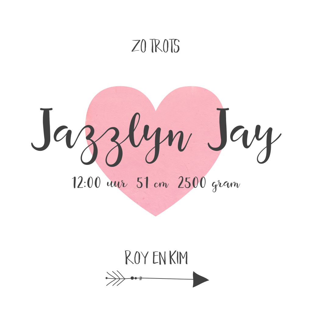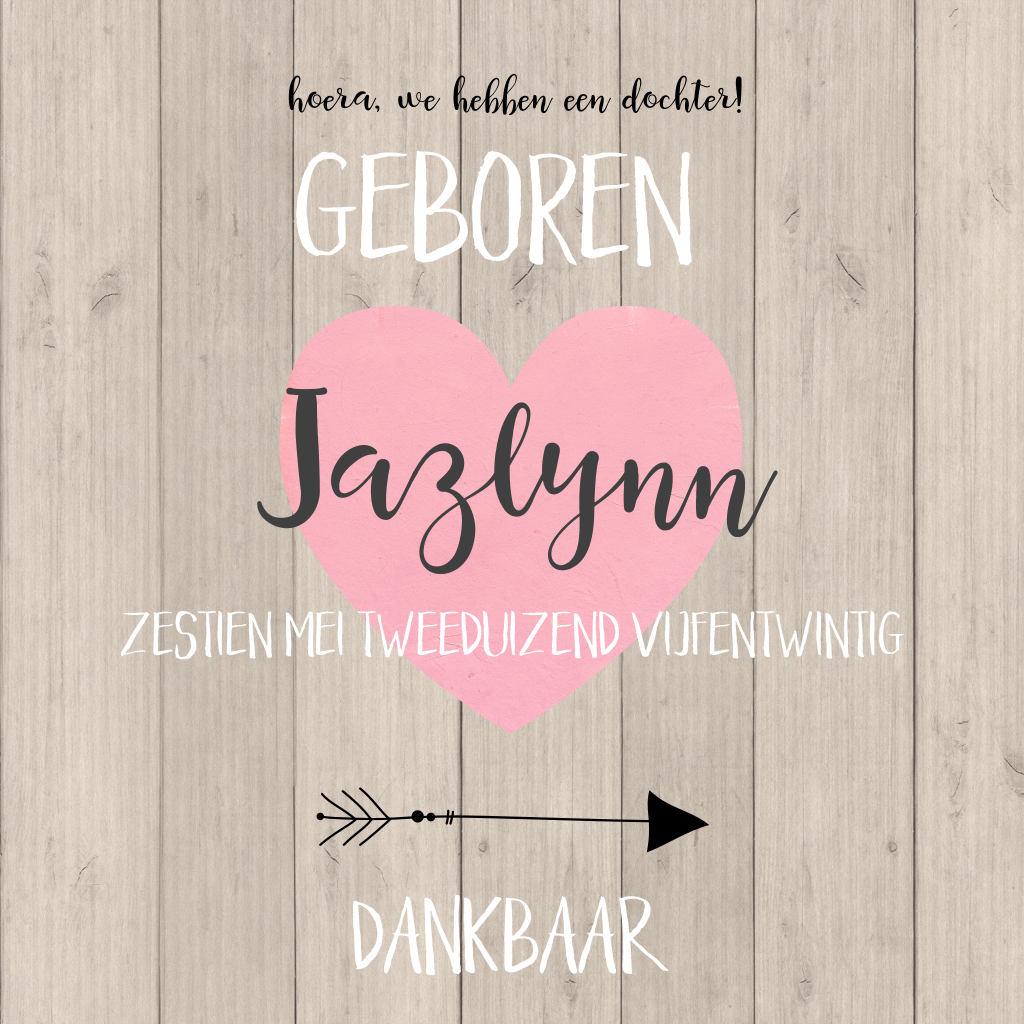 Weet jij al of je een meisje of een jongen krijgt? Dit geboortekaartje is speciaal voor de geboorte van een dochter. Het ziet er hip uit met hout en een roze hartje.