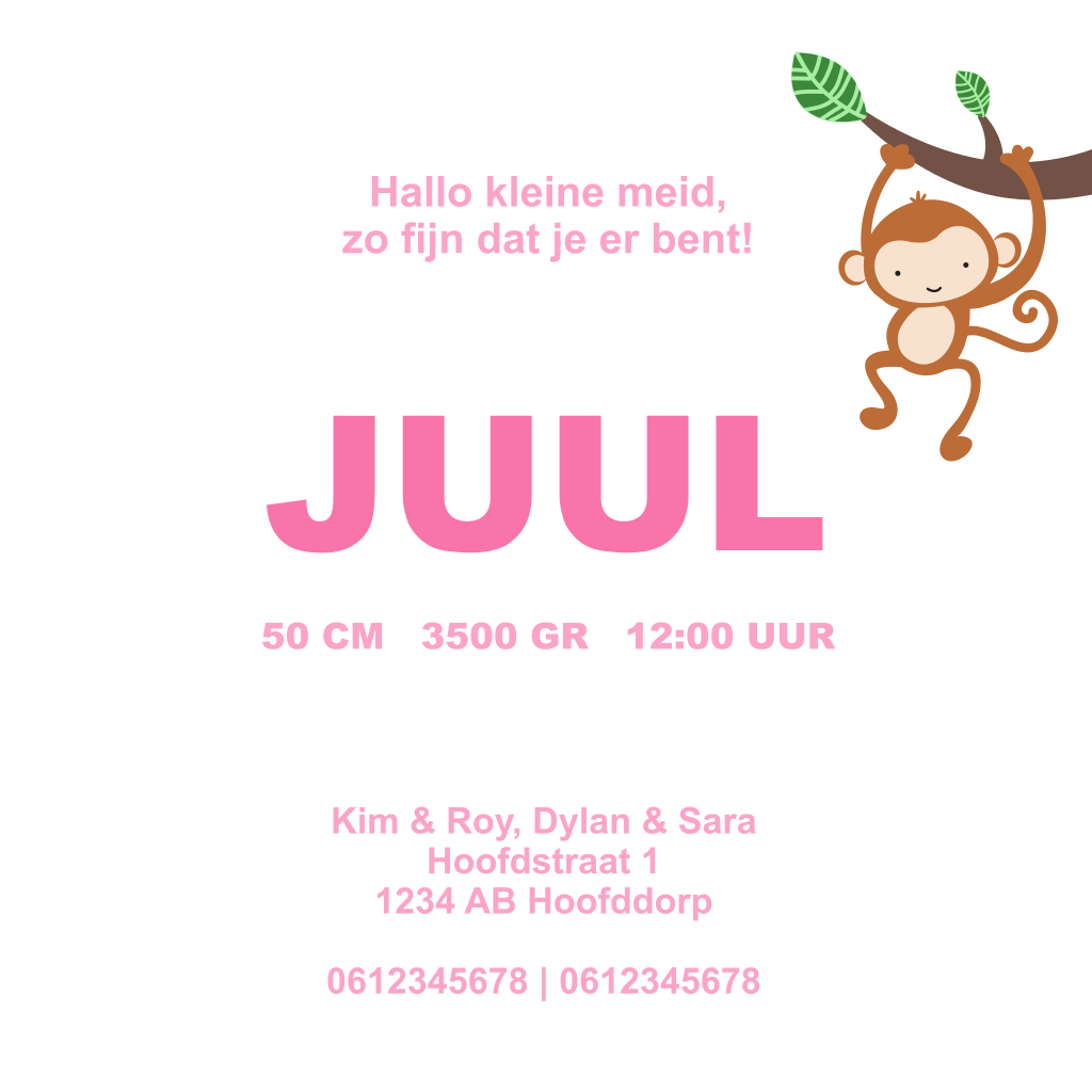Wat zijn de aapjes die in de boomtakken hangen leuk! Dit is het kaartje om de geboorte van jullie dochter mee aan te kondigen.