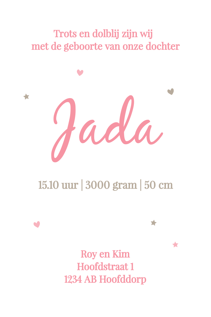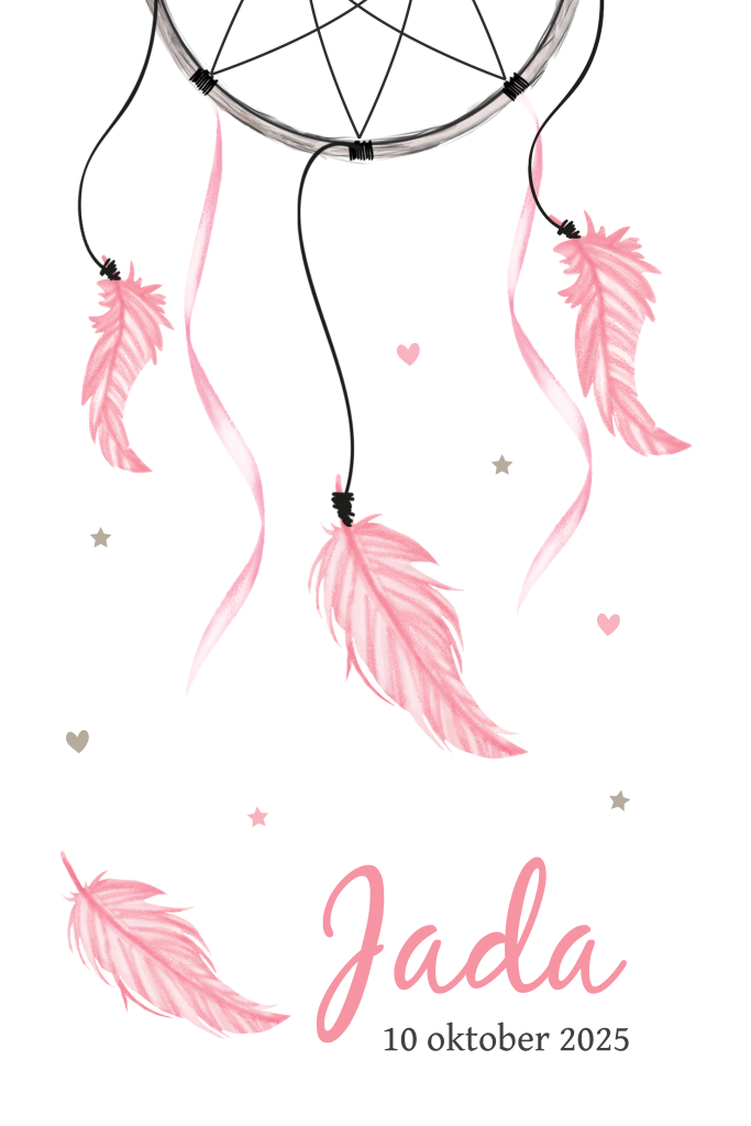 Dit geboortekaartje is heel stoer voor een meisje! Een dromenvanger met watercolour veertjes, sierlijke typografie en de roze hartjes maken het een lief, maar toch stoer geheel.