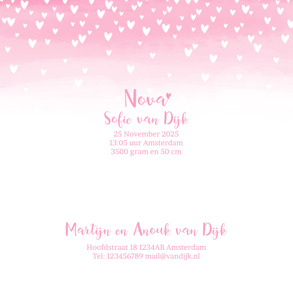 Een slapende baby onder een roze lucht met heel veel hartjes: wat een lieflijk plaatje! Op dit romantische geboortekaartje met aquarelverf kun je een persoonlijke foto toevoegen van jouw dochter.