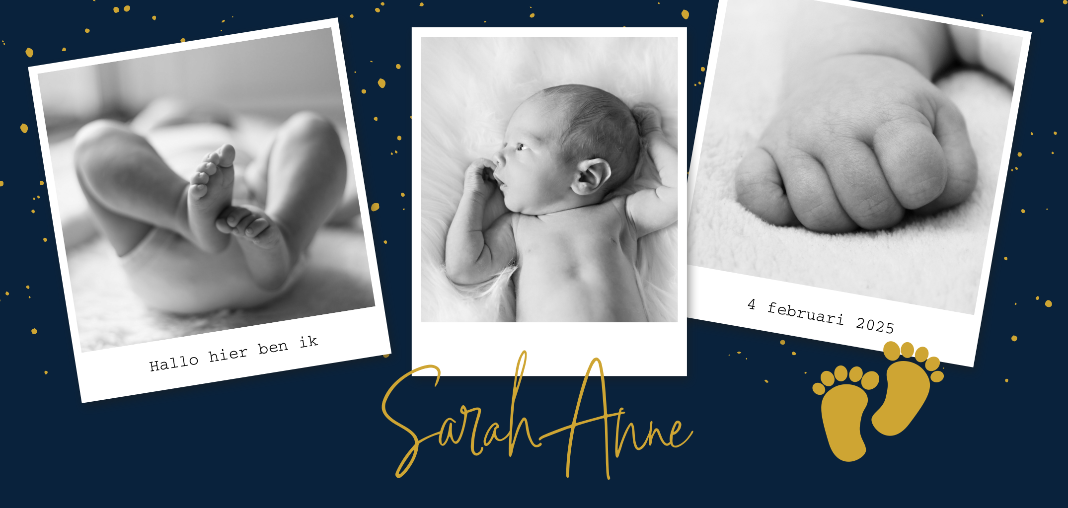 Wat een uniek panorama-geboortekaartje! Deze donkerblauwe fotokaart is gepimpt met vrolijke gele stipjes, babyvoetjes en 3 polaroid fotokaders. Echt trendy! Maak hem compleet met eigen teksten en lieve foto's!