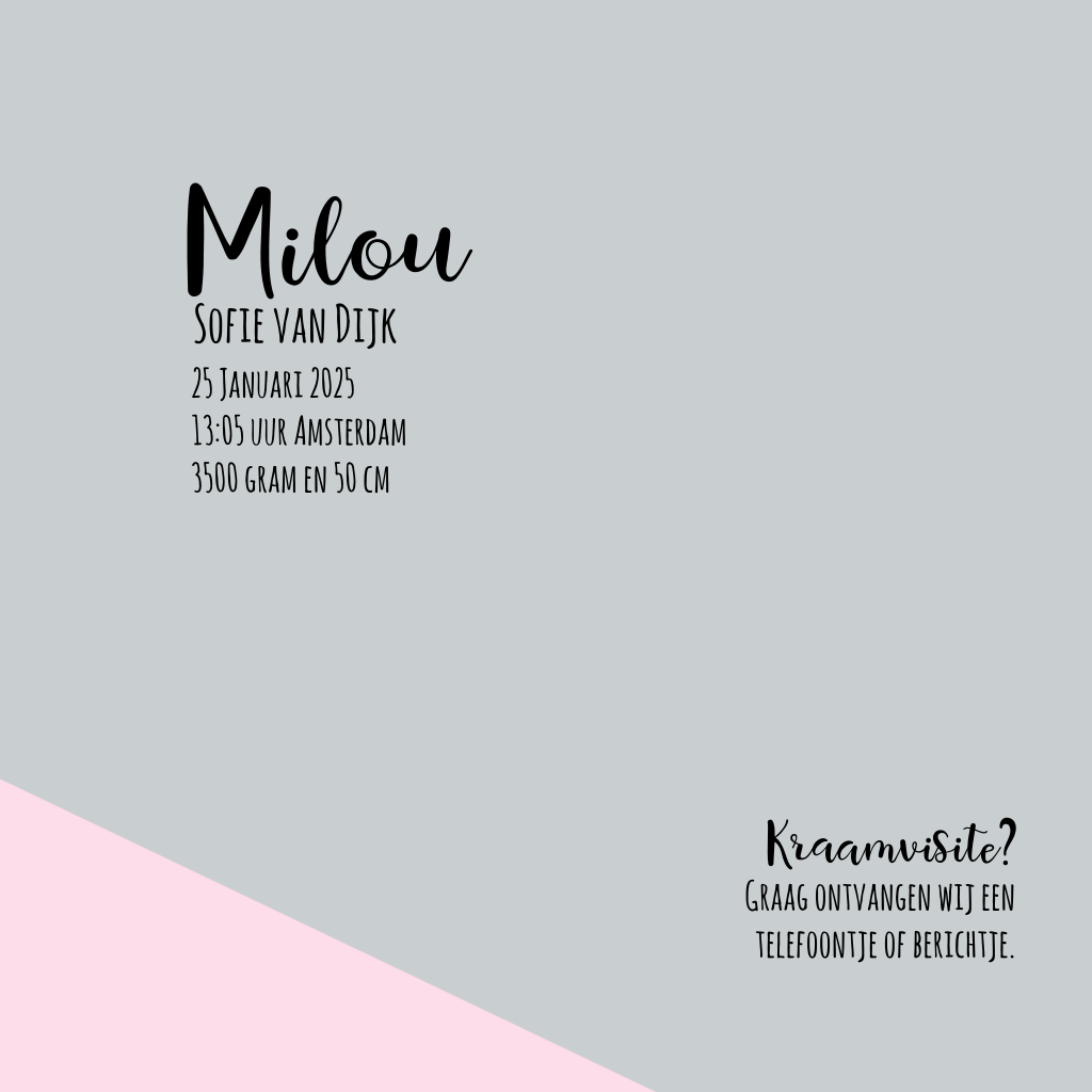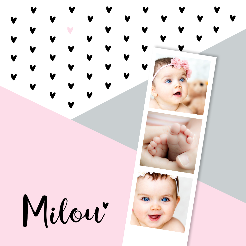 Drie foto's van jouw kleine baby op haar geboortekaartje: superleuk! De achtergrond van dit babykaartje is verdeeld in drie vlakken in verschillende kleuren, waarvan één is versierd met lieve hartjes. Deze kleuren kun je zelf naar wens aanpassen. Maak jij deze af?