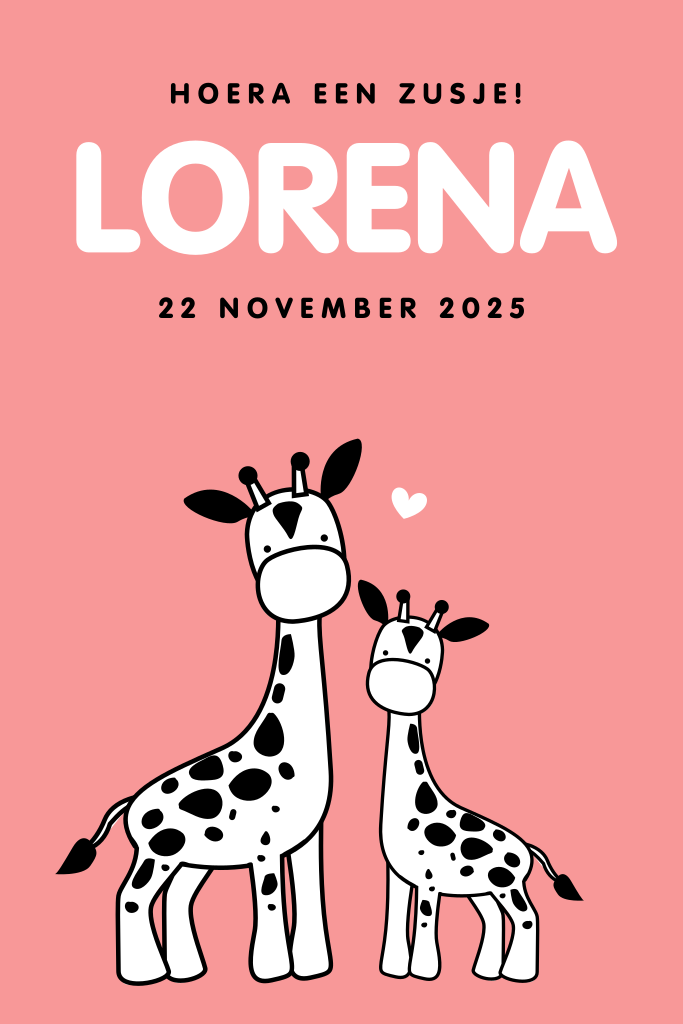 Gaaf geboortekaartje in perzikkleur met een grote giraf en een klein girafje. Extra leuk als je een tweede kindje krijgt. Wil je liever 1 giraf op je kaartje, dan haal je de andere weg.