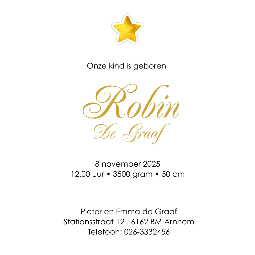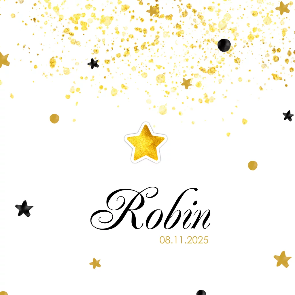 Dit hippe geboortekaartje heeft een classy kleurencombinatie van wit, zwart en goudlook. De goudkleurige verfspetters maken dit kaartje speciaal. Verder is het kaartje versierd met sterren en stippen.