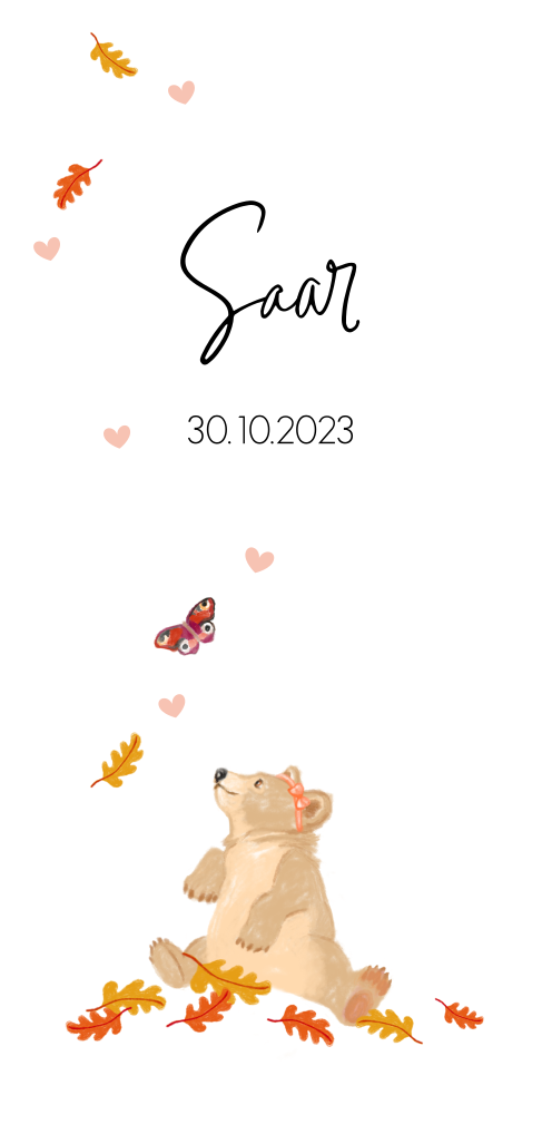Schattig geboortekaartje voor een meisje met een lieve illustratie van een beertje tussen de verkleurde herfst bladeren.