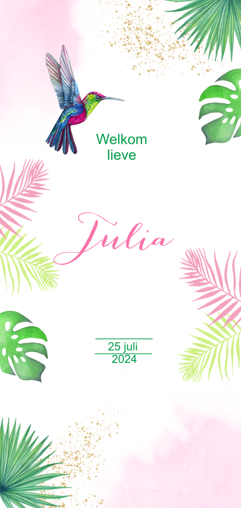 Hip jungle geboortekaartje voor je dochtertje met botanische takken en bladeren en een tropische kolibrie. De roze watercolor en goudlook verf spetters maken dit kaartje echt trendy!