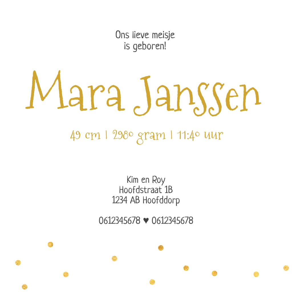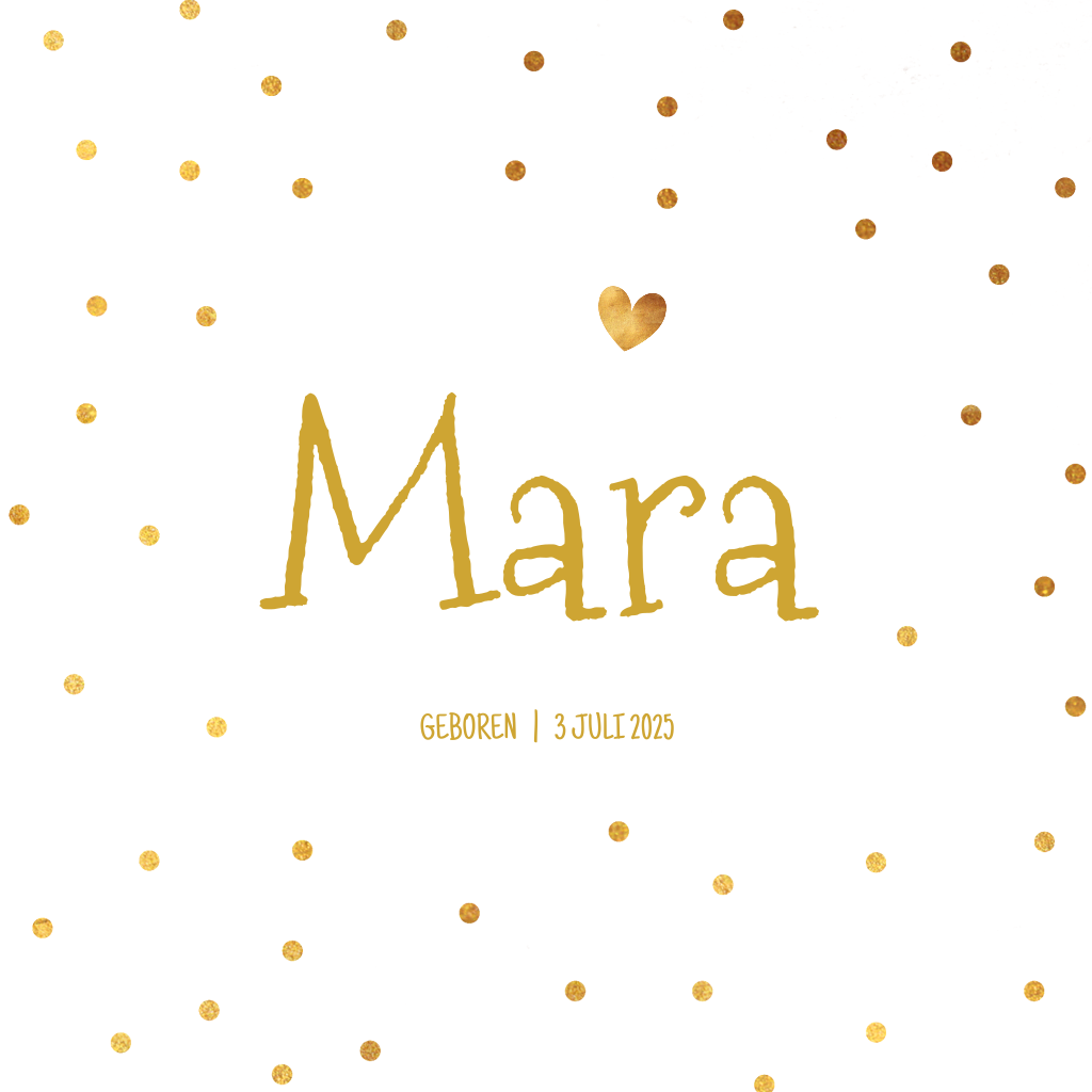 Hip geboortekaartje met goudkleurige stippen en hartjes. De speelse typografie geeft het kaartje een stoere look. Pas de kleuren en lettertypen aan naar wens in de editor.