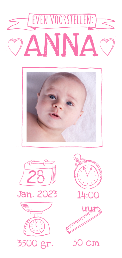 Een leuk en hip langwerpig geboortekaartje met leuke icoontjes en een foto. Vervang zelf de foto en pas de teksten aan. Je kunt ook de wijzers van het klokje draaien.