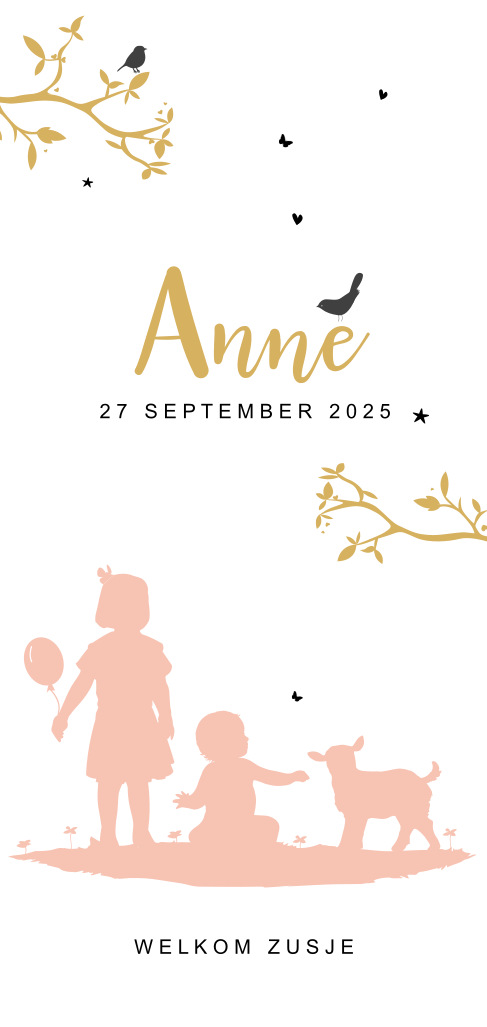Schattig geboortekaartje met een lieve peach kleurige silhouet van een grote zus met haar kleine zusje en een lammetje. In de goudlook boom takken zitten vogeltjes en er vliegen allemaal vlindertjes.