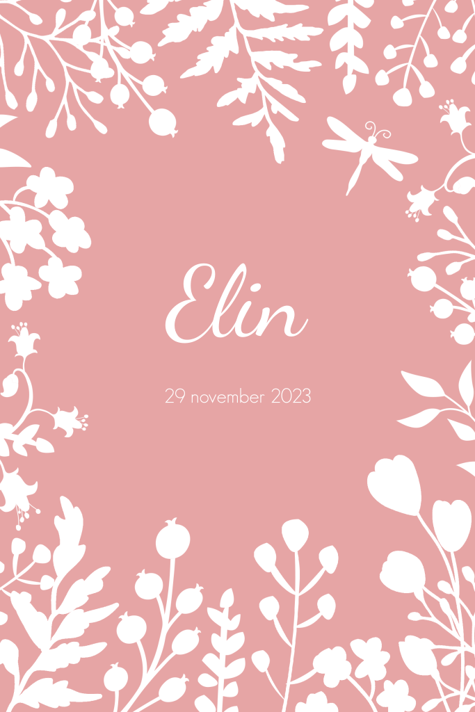 Botanisch geboortekaartje voor meisje met bloemen bladeren en libelle
