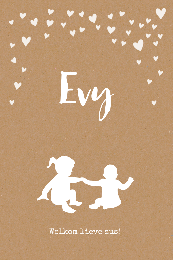 Stoer kraft papier geboortekaartje voor je tweede dochtertje met silhouet van grote zus en klein baby zusje die samen aan het spelen zijn. De hartjes maken dit echt een lief kaartje!