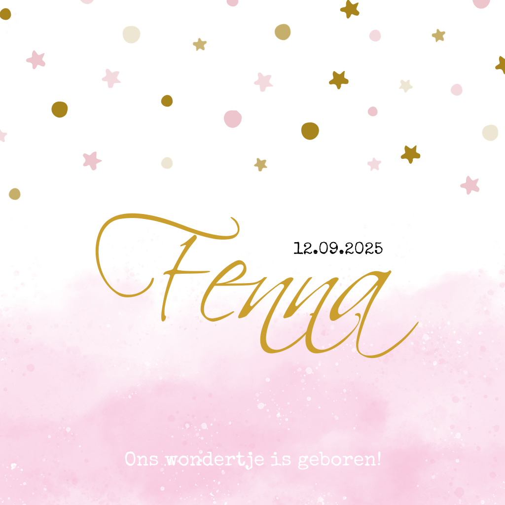 Deze hippe geboortekaart combineert roze watercolour met een witte achtergrond met roze en goudkleurige stippen en sterren. Leuk voor een meisje! Aan de binnenkant van de kaart kun je een gedichtje op de roze watercolour-achtergrond zetten. Deze kaart is met verschillende enveloppen goed te combineren. Denk bijvoorbeeld aan goudlook, wit, lichtroze of knalroze!