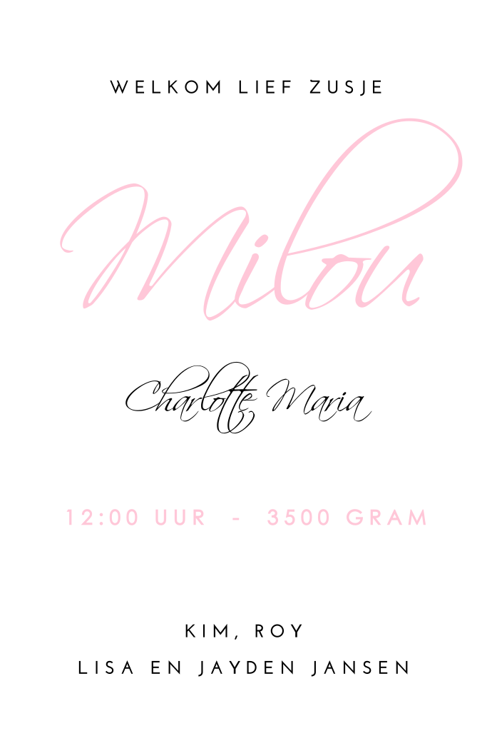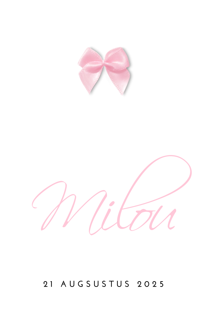 Lief kaartje met simpel ontwerp voor de geboorte van een klein meisje. Het echte strikje maakt dit eenvoudige kaartje heel speciaal. Pas de lettertypes en kleuren aan en plaats aan de binnenkant een mooie foto van de kleine meid en maak zo je eigen geboortekaartje. Tip: dit kaartje is extra mooi op oud-Hollands papier.
