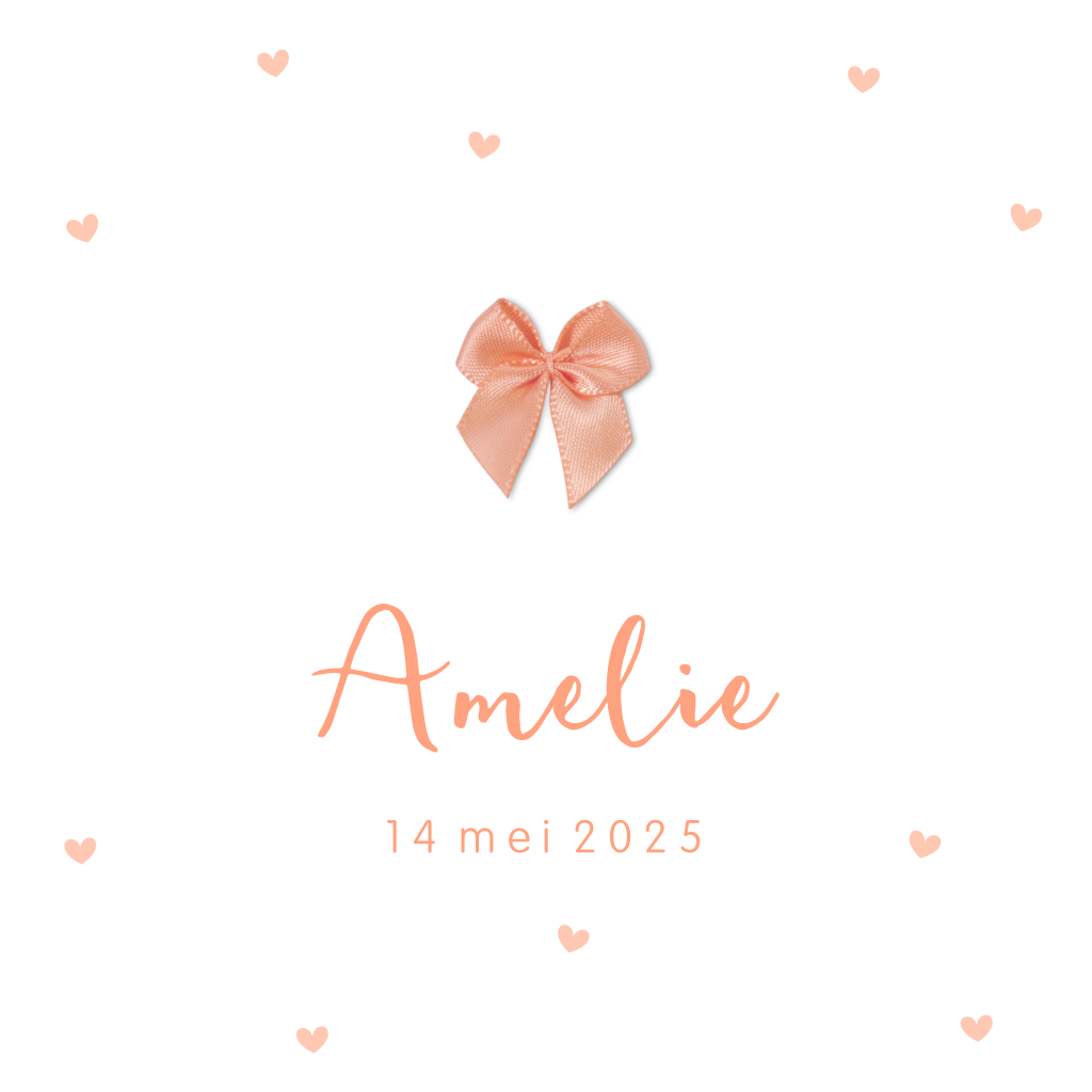 Een klassiek geboortekaartje voor een meisje in perzik kleur met lieve hartjes en romantische krullen. Het perzik strikje maakt dit kaartje helemaal af!Het strikje op dit kaartje wordt niet mee gedrukt, deze is ter voorbeeld. Op die plek kun je straks zelf het échte strikje plakken.