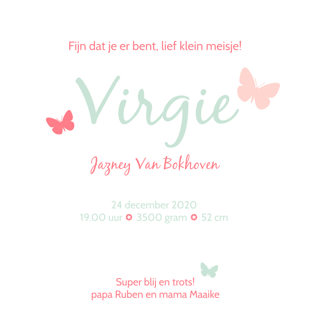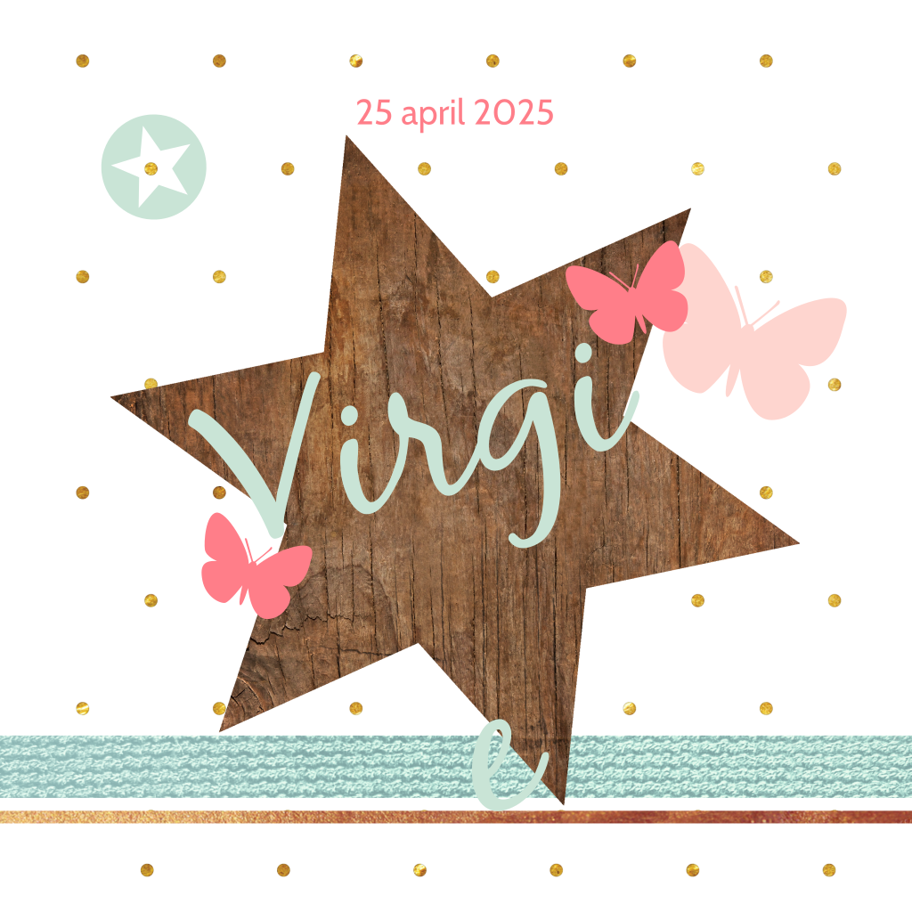 Klassiek geboortekaartje voor een lief meisje met een houten ster en roze vlindertjes. Op de achtergrond staat een patroon van goudkleurige stippen.