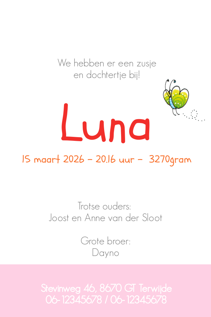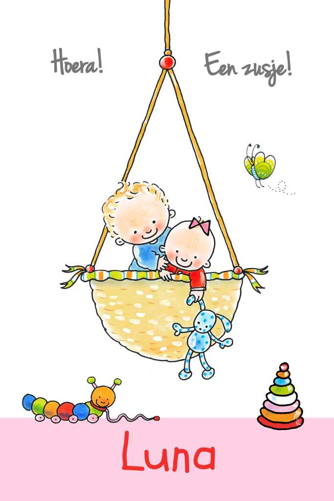 Wat een lekker eigentijds, uniek geboortekaartje met illustraties van Pauline Oud. Speciaal voor de geboorte van een zusje. Je kunt de vlinder en de kindjes aan de binnenkant op de plek zetten die jij wilt, om het kaartje nog mooier te maken.