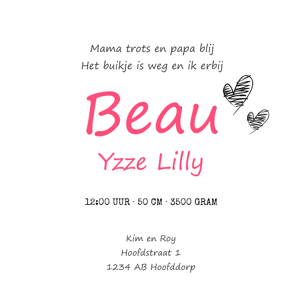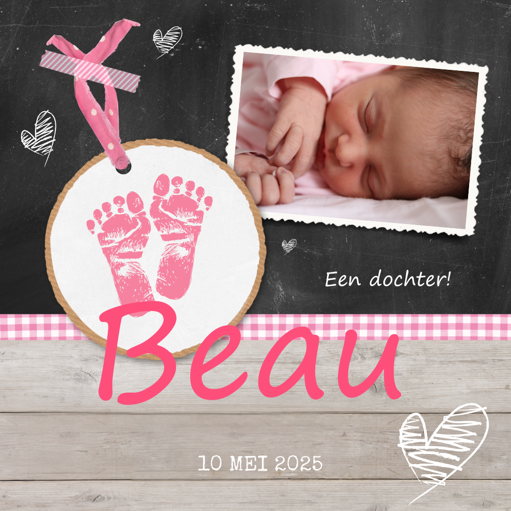 Stoer geboortekaartje voor een meisje: alle elementen staan erin: hout, krijtbord, een label, voetjes en een lintje met ruitjes. Zelfs de babyfoto van je dochter kan je een plaats geven. Echt mooi!