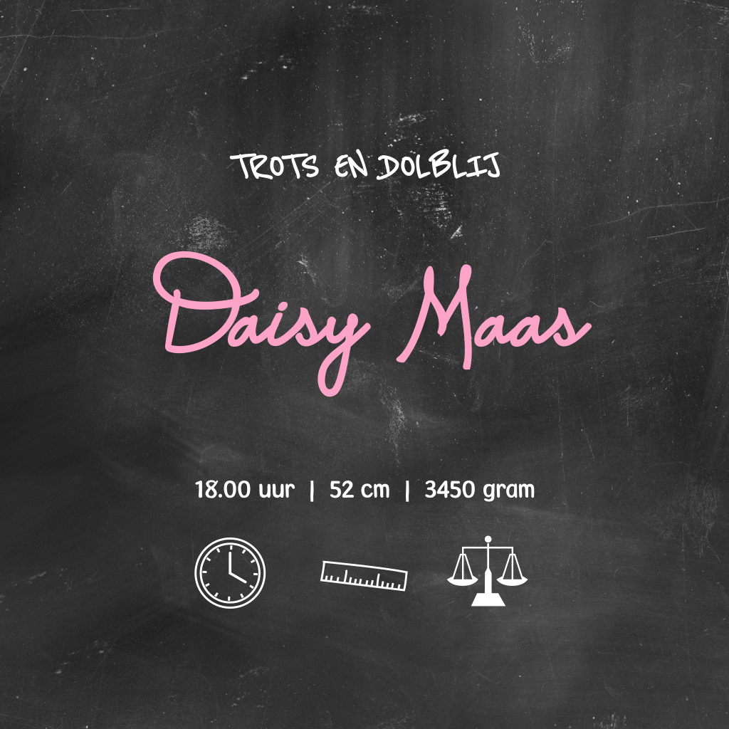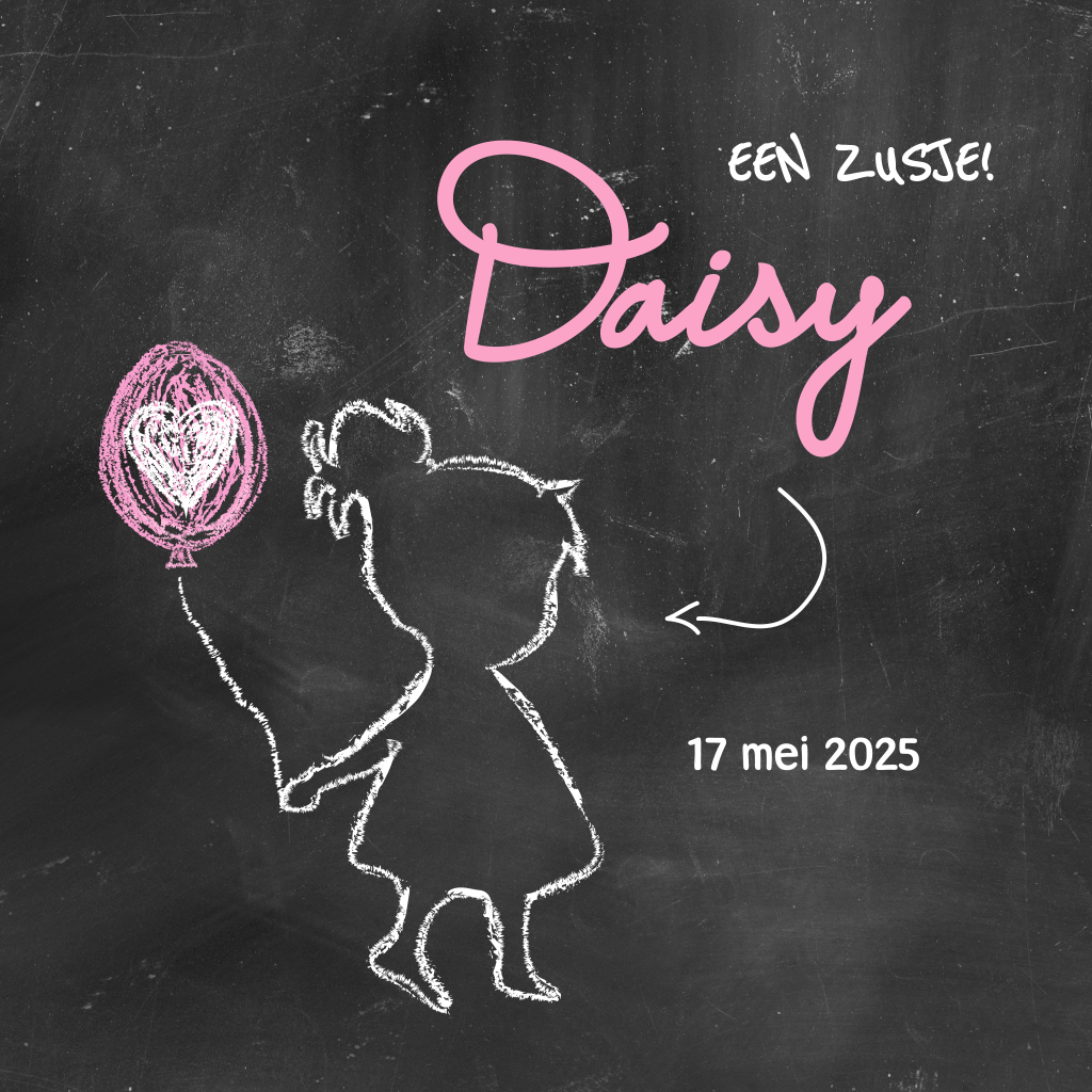 Leuk getekend meisjes op een krijtbord achtergrond. Het kindje heeft een getekende ballon vast. Lekker vrolijk voor een geboortekaartje of kraamborrelkaartje.