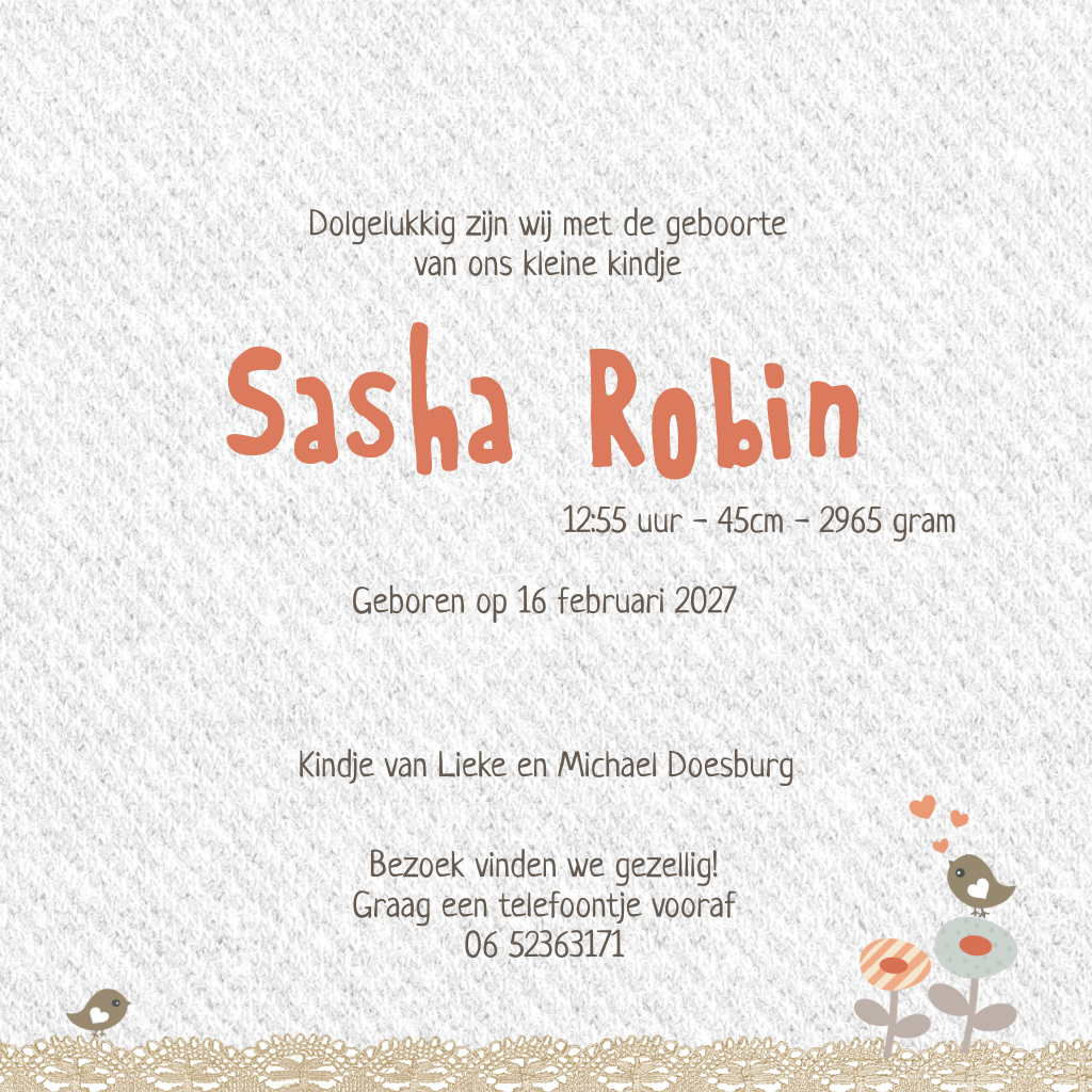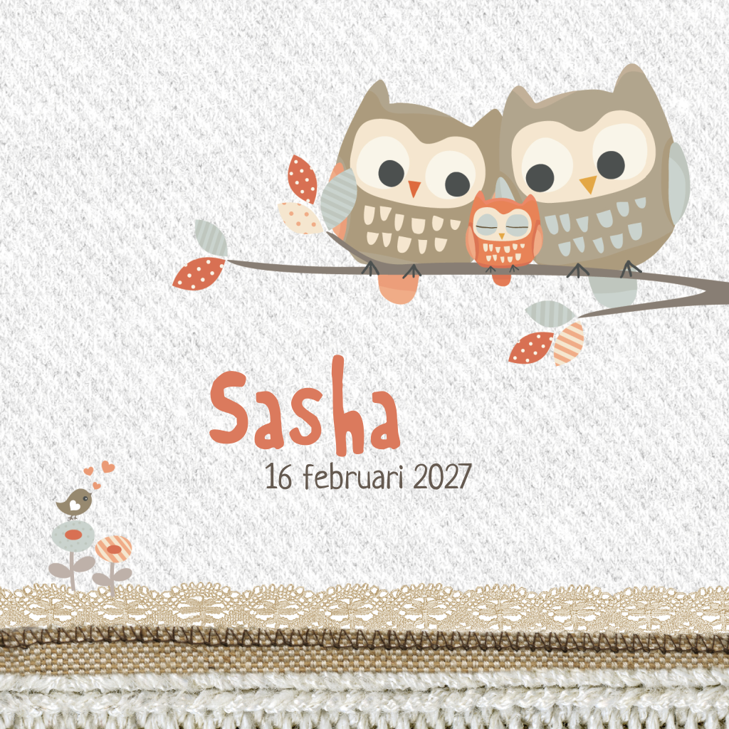 Leuke geboortekaart voor een meisje met familie uil op een tak. Op de babykaart staan illustraties van bloemen, vogels en vlinders. De kant maakt deze kaart helemaal af. In de editor kun je de tekst makkelijk aanpassen.