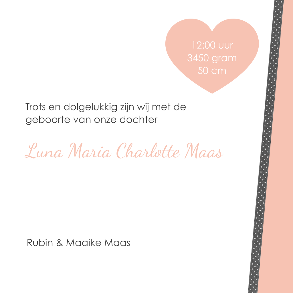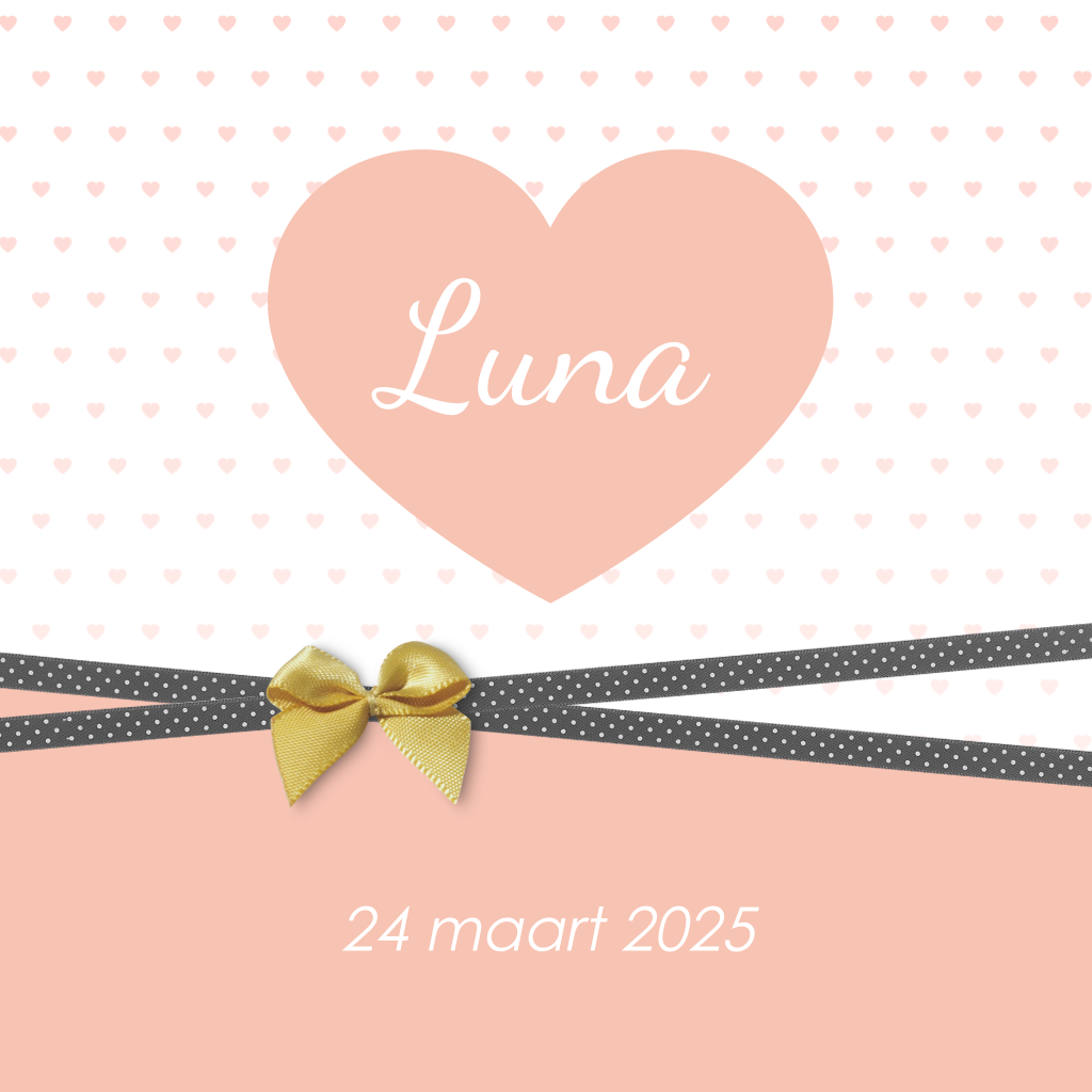 Klassiek kaartje voor de geboorte van je dochter met lieve hartjes in perzik kleur en een stoer lintje. Het echte gele strikje maakt dit kaartje helemaal hip!