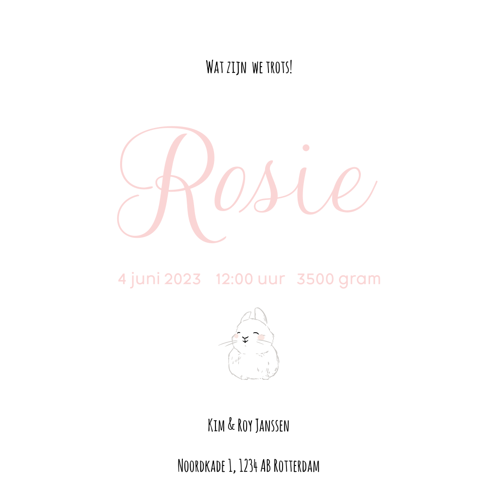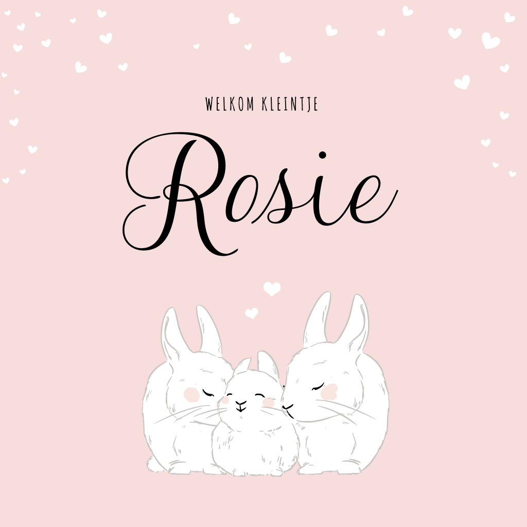Schattig babykaartje voor de geboorte van een dochter in roze, met lieve konijntjes en hartjesregen. De tekst en de lettertypes kunnen in de editor aangepast worden.