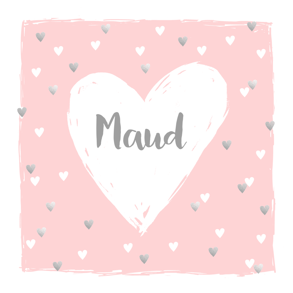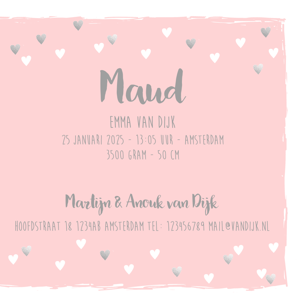 Een schattig geboortekaartje in zacht roze met hartjes in wit en zilver. Pas zelf de kleuren en lettertypes aan zodat het kaartje helemaal naar wens wordt.