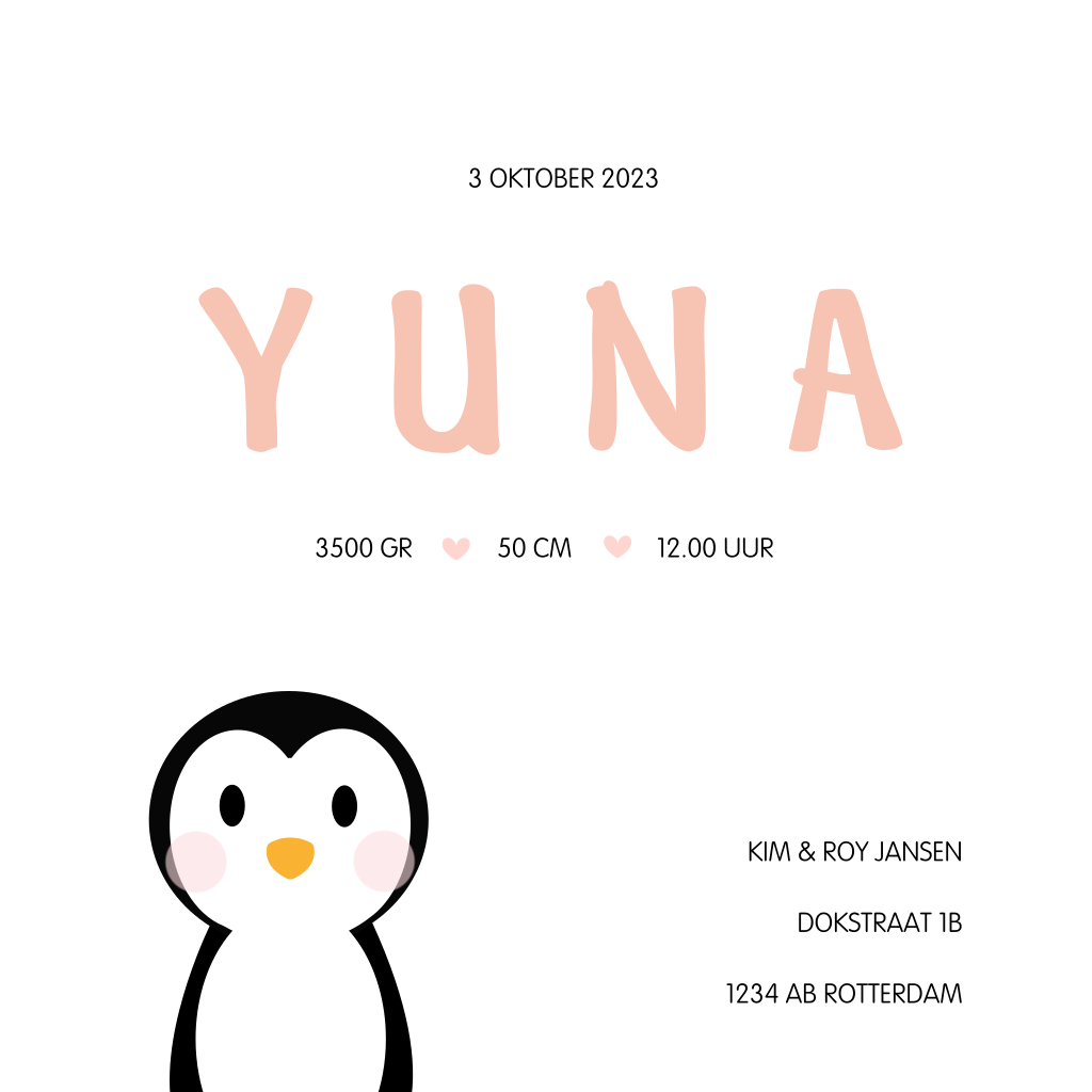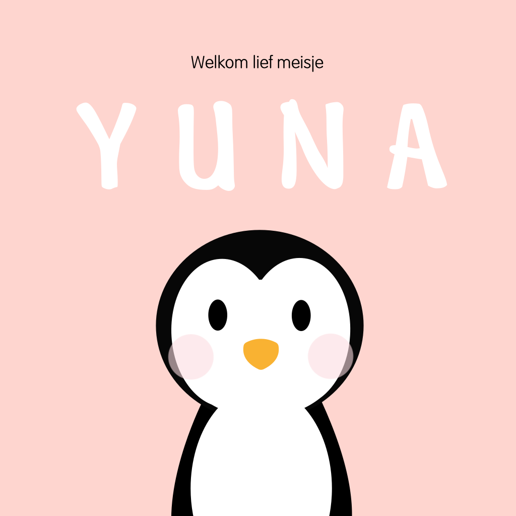 Lieve geboortekaart voor je dochtertje met een schattige illustratie van een baby pinguïn op een peach-kleurige achtergrond.