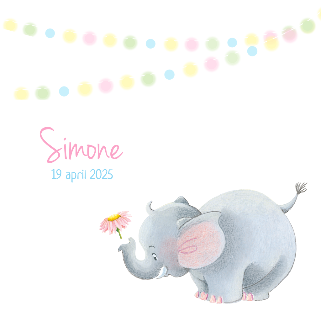 Vind je olifantjes ook zo lief? Dit kaartje heeft een lieve slinger en je ziet een baby-olifantje een bloemetje wegblazen. Pas het kaartje zelf aan in onze editor.