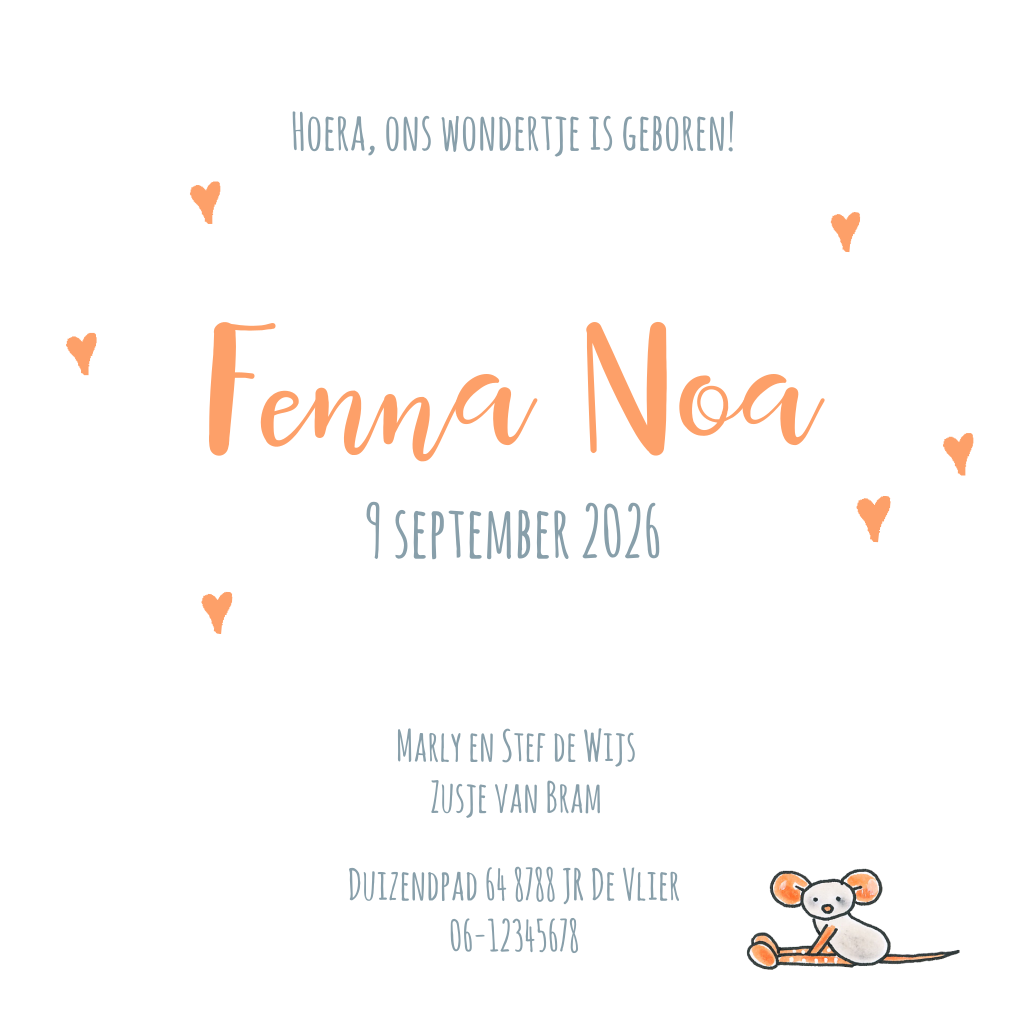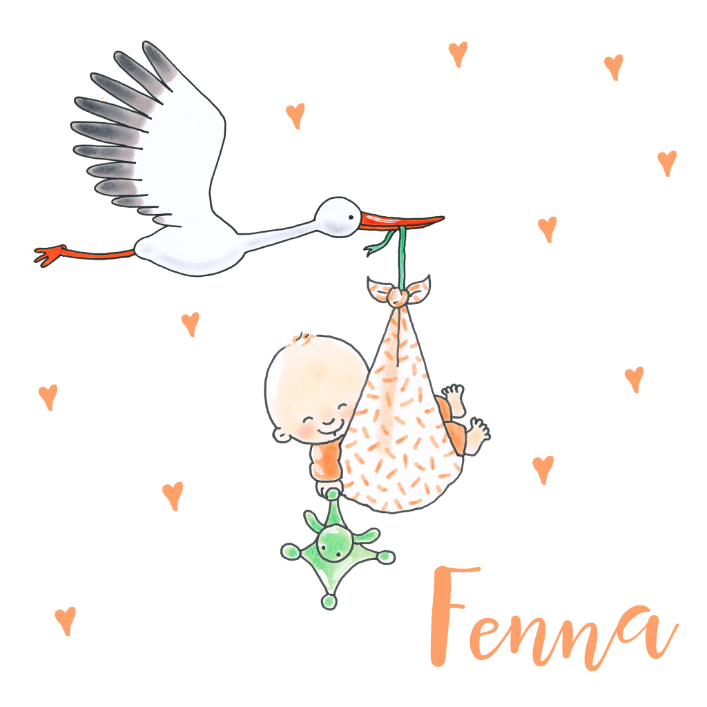 Vrolijk geboortekaartje voor een meisje met getekende ooievaar met baby en oranje hartjes. Pas kleuren en lettertypen naar wens aan in de editor.