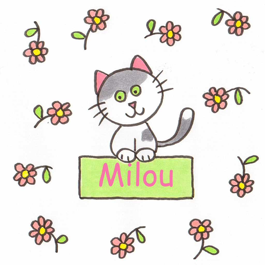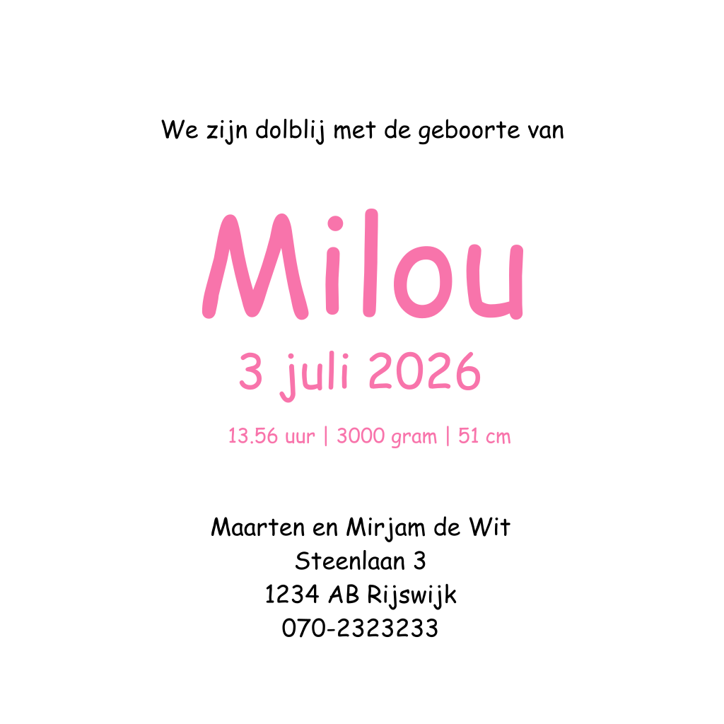 Blits getekend ontwerp van geboortekaartje met roze bloemetjes en een kat. Voeg jullie tekst toe aan het kaartje en maak van dit ontwerp jullie eigen verhaal.