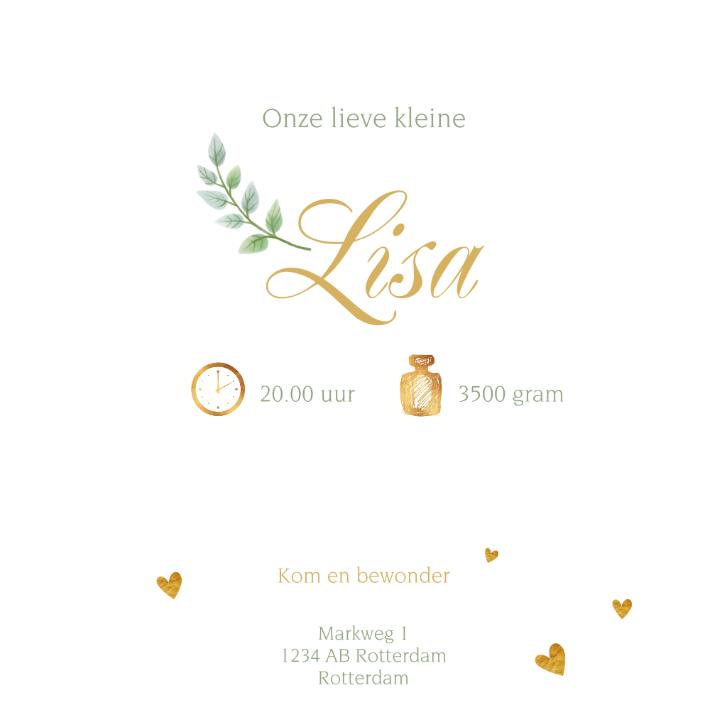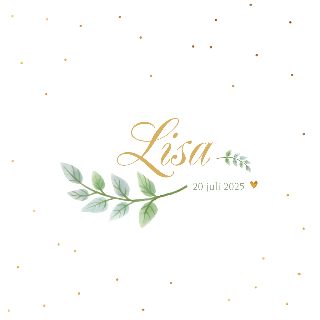 Hip geboortekaartje voor een lief meisje met goudkleurige letters en stipjes en als versiering groene takjes.