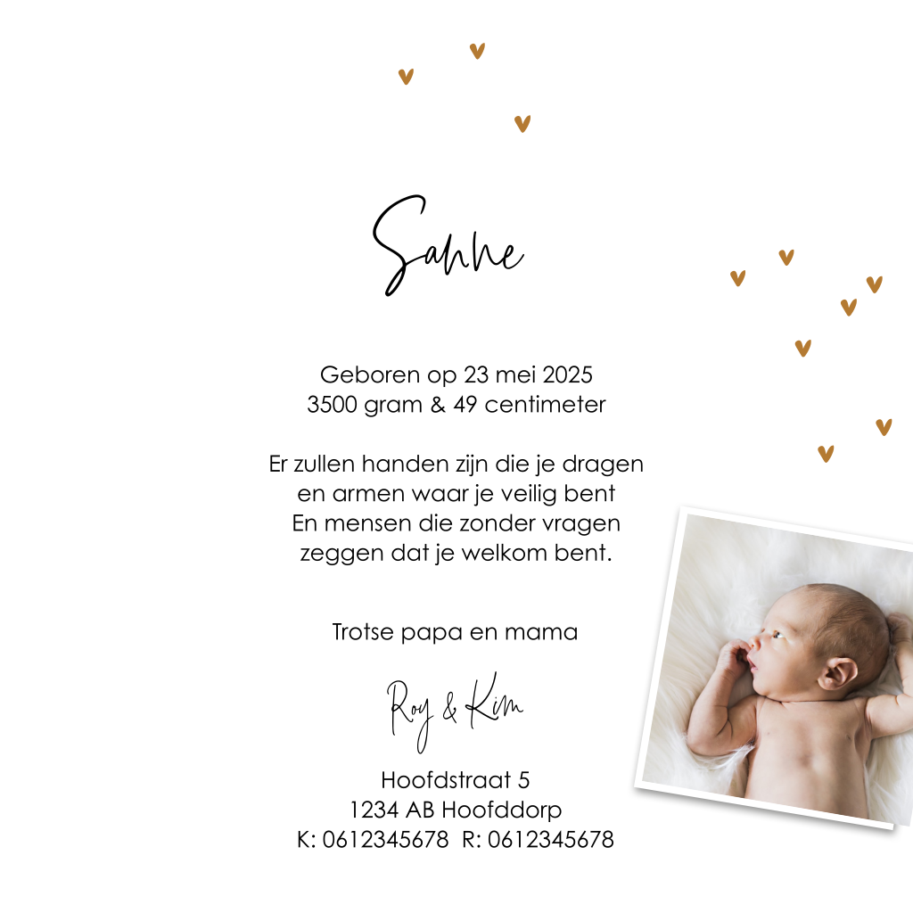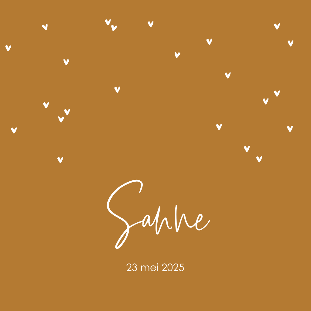Hip geboortekaartje met lieve kleine hartjes op de voorkant. Aan de binnenkant is ruimte voor lieve versjes en gedichtjes voor de geboorte van je meisje.