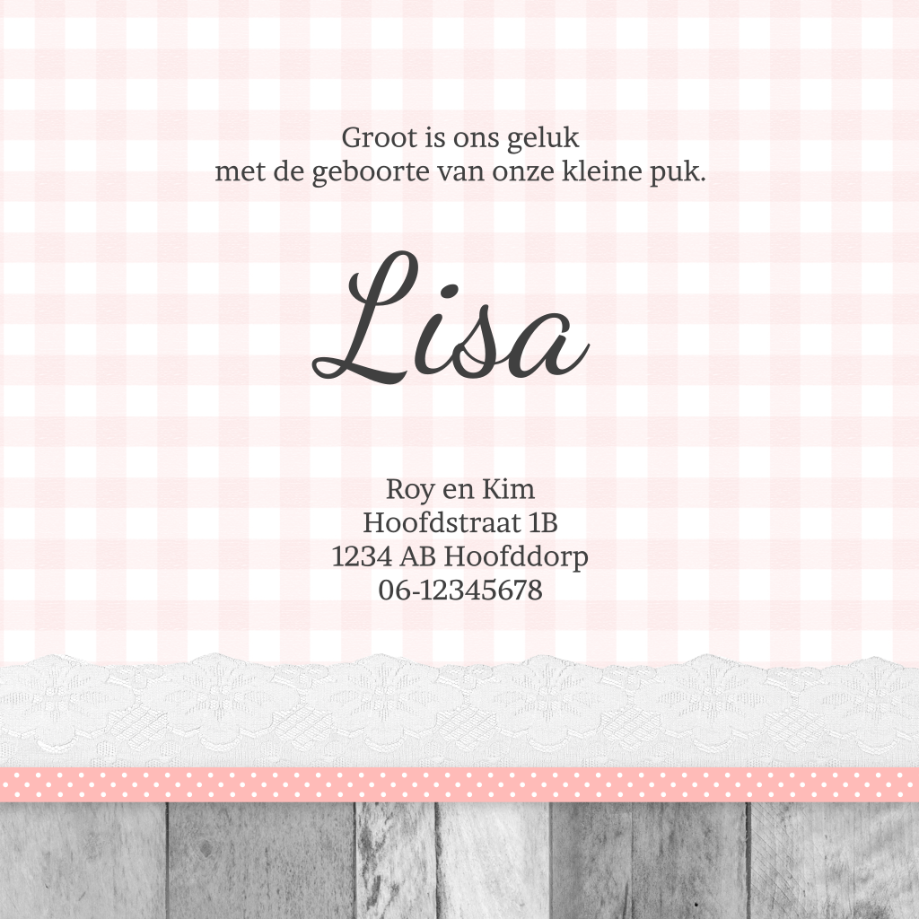 Dit stoere geboortekaartje heeft een vintage tintje doordat er allerlei lagen over elkaar zijn gelegd: een foto staat te midden van een ruitenstofje, een hart, kant, roze roosjes een lintje en hout.