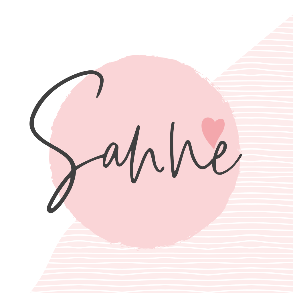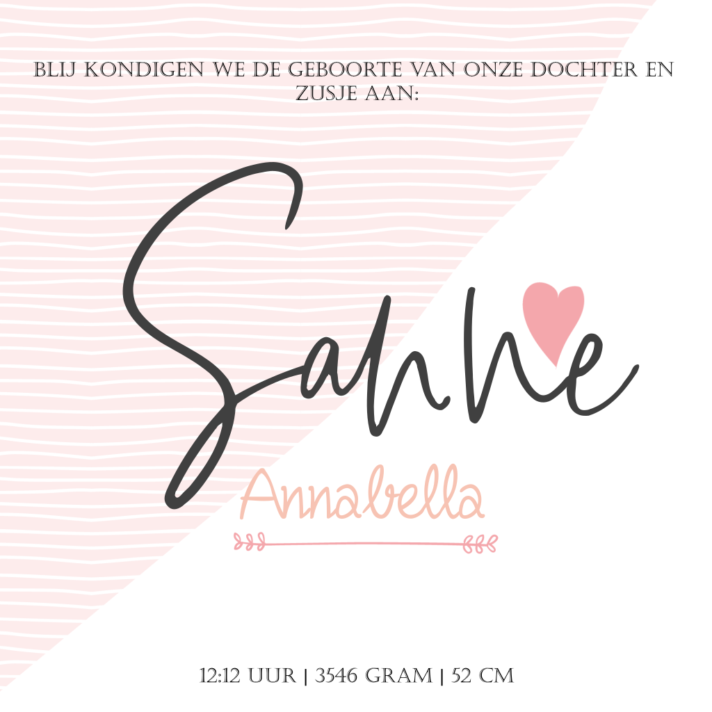 Roze babykaartje voor een meisje. Gepimpt met geometrische patronen, roze streepjes en een lief hartje. Teksten en lettertypes zijn naar wens aan te passen!
