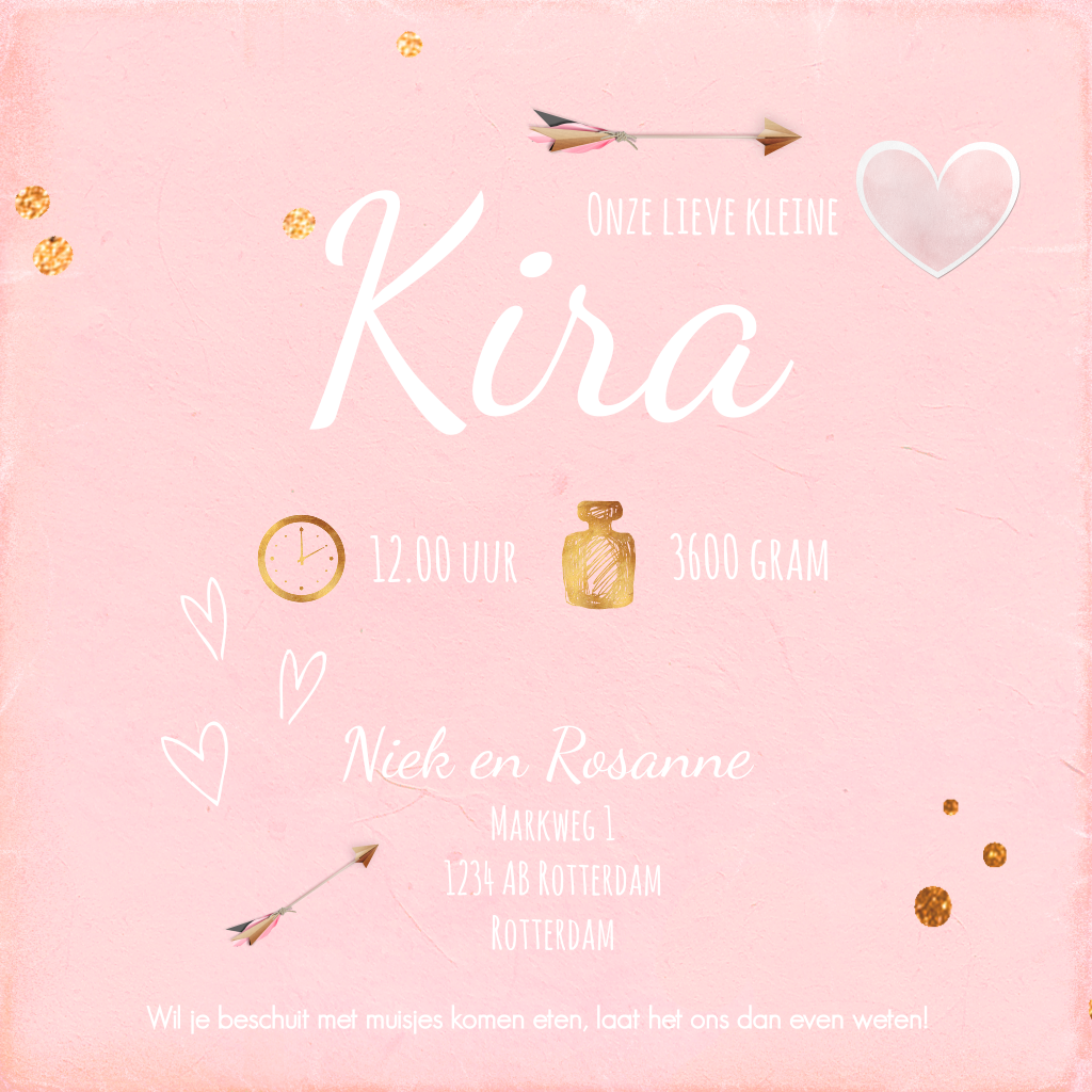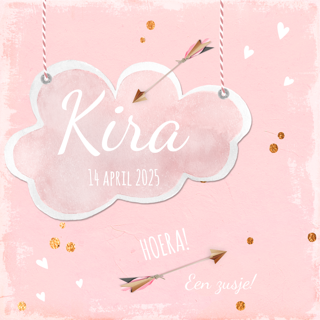 Wat een feestje als je baby komt! Dat is hier wel te zien met de goudkleurige stippenconfetti en het vrolijke wolkje op de voorkant. De pijltjes maken het helemaal af.