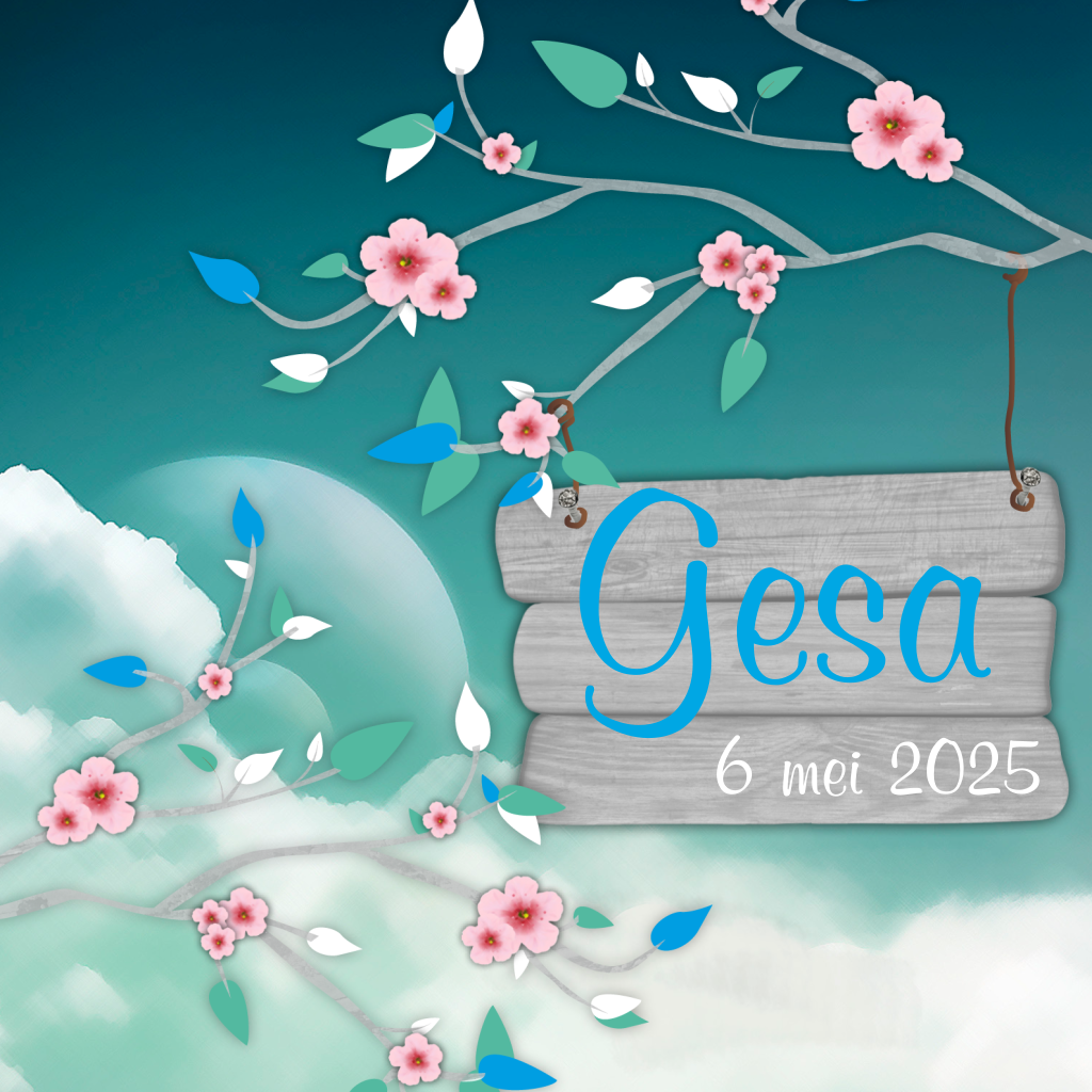 Prachtig geboortekaartje met pasteltinten, zoals groen, lichtblauw en roze, om de geboorte van je meisje aan te kondigen. Het kaartje is helemaal in de sprookjes-sfeer door de wolken en de takjes en zelfs wat sloophout. Binnen in het kaartje vind je nog een mooie bloem.