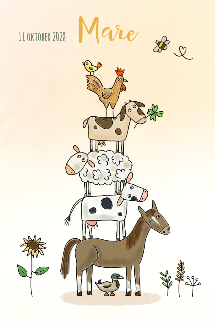 Een hip geboortekaartje met stapel boerderijdieren voor een meisje. Met veel leuke details en een achtergrond met kleurverloop is deze babykaart heel origineel. Pas de tekst makkelijk aan in de editor.