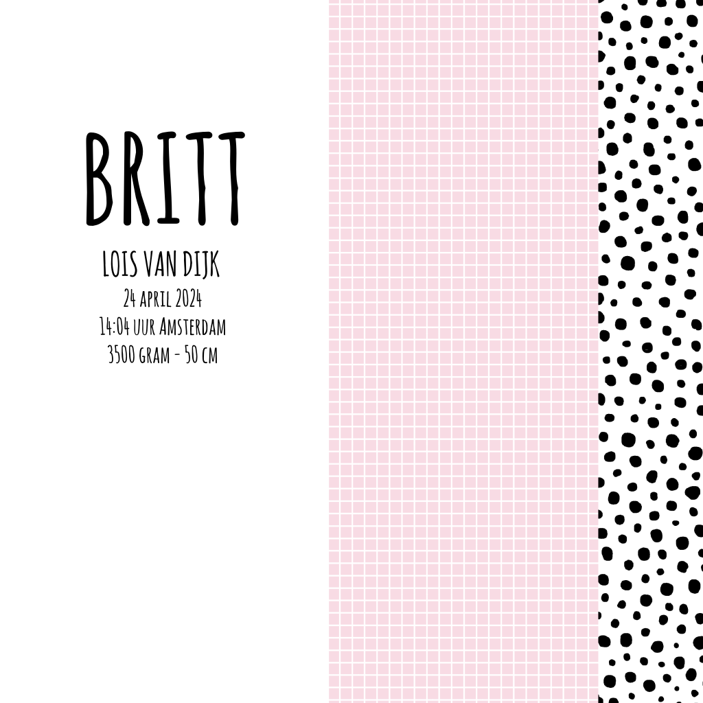 Een hip en stoer geboortekaartje met stippen- en ruitpatroon voor een meisje. De roze kleur is aanpasbaar. Pas ook de teksten aan in de editor.