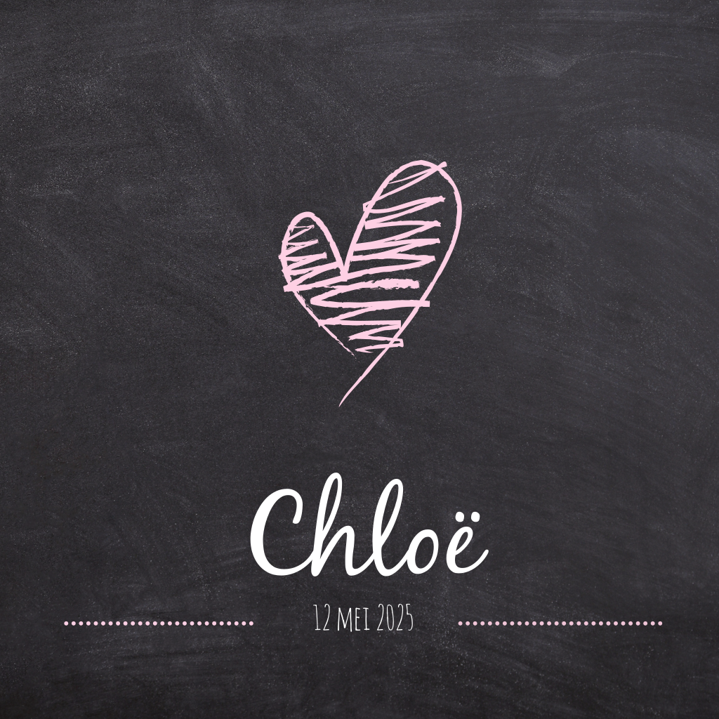 Stoere geboortekaart voor de geboorte van je dochter met een krijtbord-look achtergrond met daarop een lief hartje met krijt getekend.
