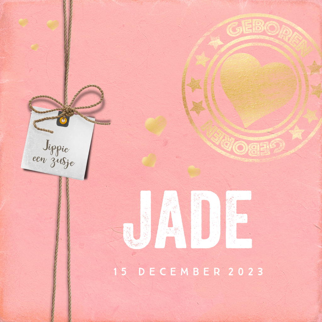 Stoere geboortekaart voor je pasgeboren dochtertje met op een peach achtergrond een goudlook stempel en een touwtje met een label waarop staat: "Jippie een zusje!"