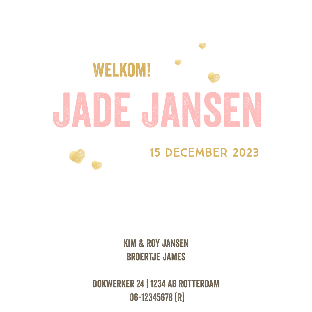 Stoer geboortekaartje voor meisje met goudlook stempel en labeltje