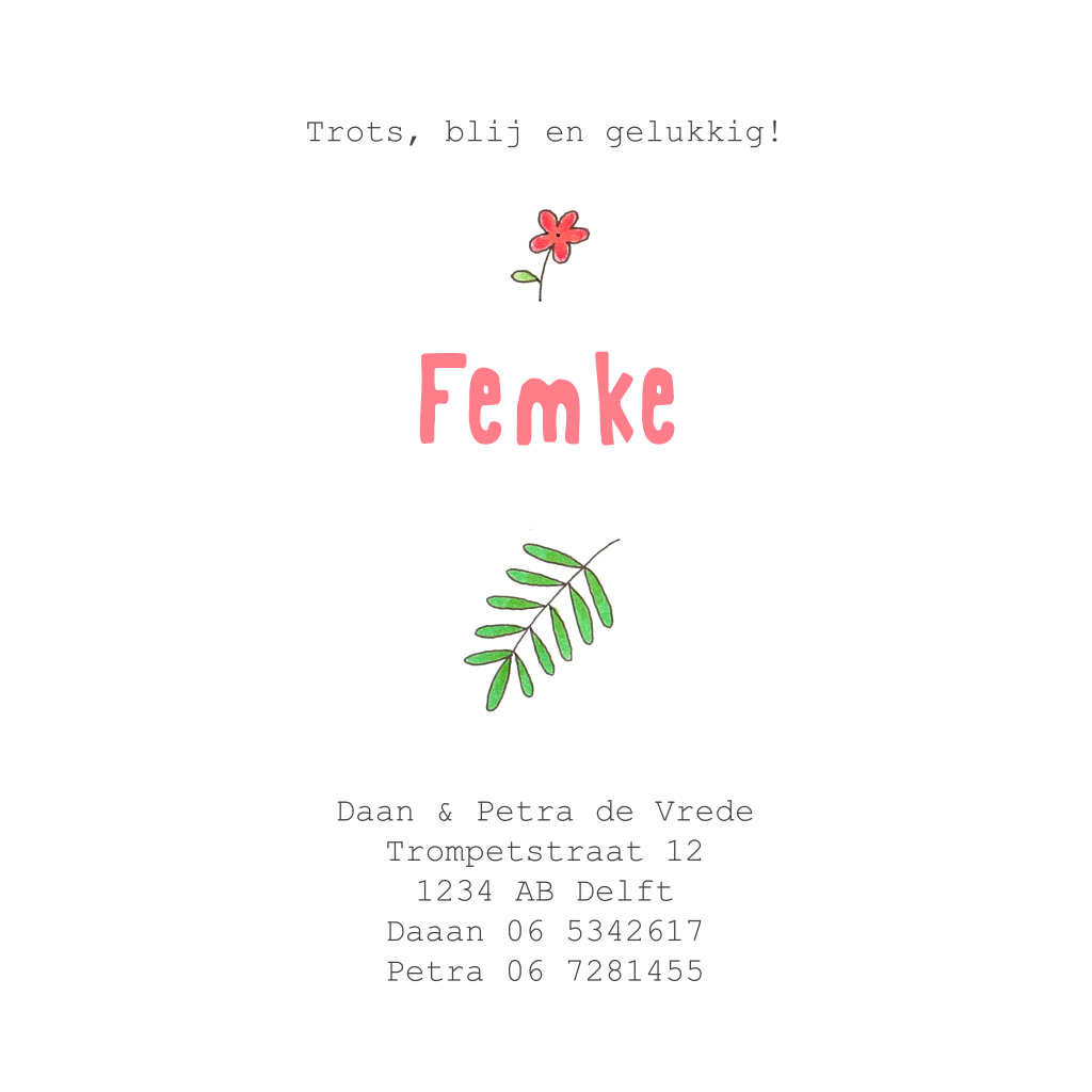 Een vrolijk, getekend geboortekaartje voor een meisje met dieren en planten op een roze achtergrond. Kleuren en lettertypen kunnen naar wens worden aangepast in de editor.